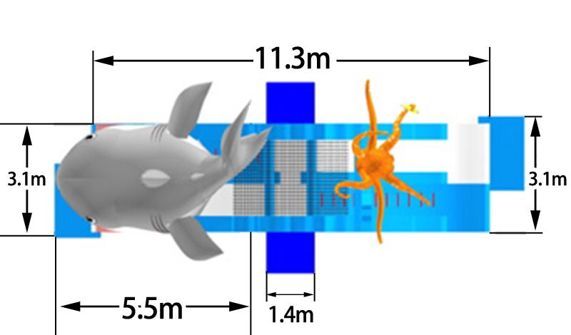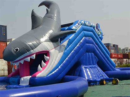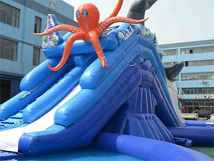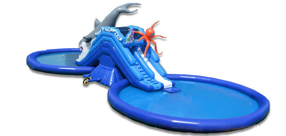 両側にサメとタコの大きなモチーフがついた両面滑り台つきプール レンタルのご紹介です。実際に設置すると6mもの高さがあり、非常に目立ちます。特にサメの滑り台のほうは、サメの口の中を滑ることができるので、子供達にとってはワクワクドキドキします。夏場のイベント会場にぴったりな両面滑り台つきプールは、子供達に大人気のアイテムです。滑る時は腕を組んで滑るよう説明をお願いします。