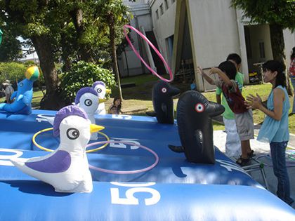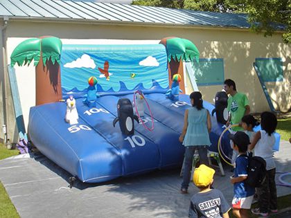 空気で膨らむふわふわ遊具の輪投げゲームです。海の中にオットセイ・カモメ・ペンギンが居て、足元に得点が書かれています。フラフープ型の輪を投げて動物に見事輪っかを通すことができれば、足元に書かれた点数をゲットすることができます。得点はペンギンが10P、カモメが50P、オットセイが100Pです。高得点を目指してみんなで競い合って盛り上がりましょう!