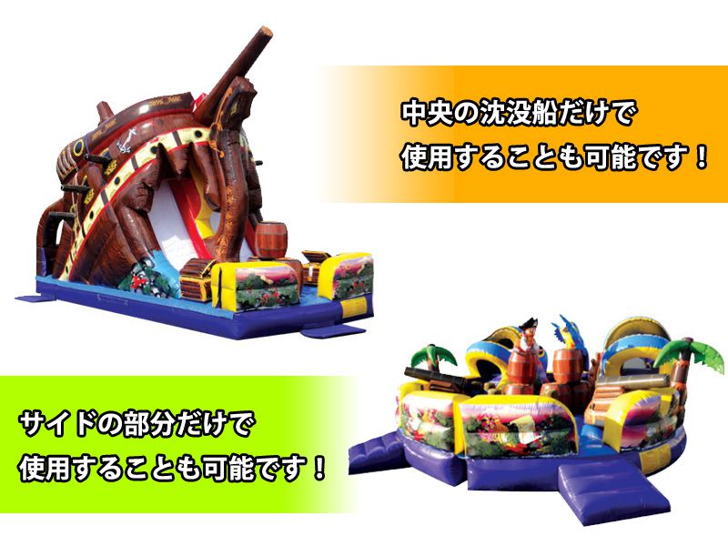 冒険ものが大好きな子供達に大人気のたからじまキッズスペースのご紹介ページです。空気で膨らませて完成します。中には難破船も滑り台もあり、思う存分遊べます。たからじまの中に何か景品を隠しておいて、探し出す催し物を開催しても面白いですね。尚、こちらのたからじまキッズスペースは、一体型になっているのではありませんので、難破船の部分とその他の部分とを分けて並べたり、少し離れた場所に設置するという使い方もあります。
