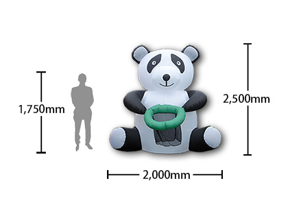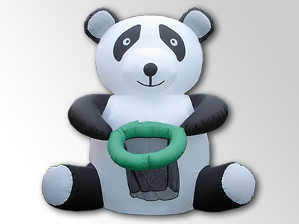 パンダ型のエアポップ『パンダ型エアーバスケット』です!パンダの手にはバスケット(カゴ)があり、そこに目がけてボールを投げ入れて遊ぶことができます!ボールは6個あり、入った個数によって景品をプレゼントしたりしてみてはいかがでしょうか!高さが2.5mあるので遊具としてだけでなく、アイキャッチ効果・集客効果も期待できるエアポップです!パンダブームの今、その効果は特に大ですよ!