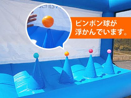 一般的な弓矢のゲームよりは少々難易度が高くなるピンポン玉を狙う弓矢ゲームのご紹介です。空気の力で空中にふわふわ浮いているピンポン玉を弓矢で狙います。お子様の場合と大人の場合では、ピンポン玉までの距離を近くしたり、遠くしたりして、立ち位置を工夫すれば楽しく遊べます。