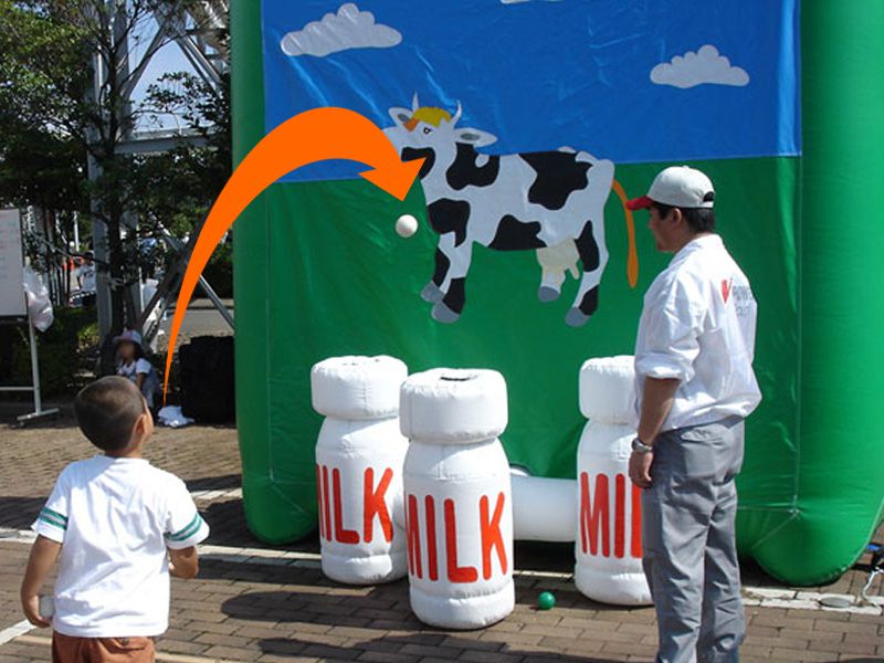 シンプルがゆえに難しい!牛乳瓶玉入れゲームのご紹介です。牧場をイメージしたバックに巨大牛乳瓶を設置し、ボールを瓶の穴に投げ込み、入った数を競います。簡単なようですが、なかなか思ったようにはいきません!集中力とコントロールが試されるこちらのゲームはお子さんだけではなく、大人の方も白熱してしまいます。プレイする方に合わせて、距離を変えてあげるとより楽しんでいただけますよ!動物関連のイベントやファミリーイベントにお勧めです。