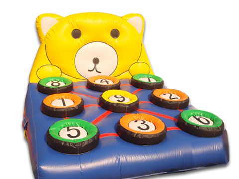 大きなクマさんのお顔がとてもインパクトのあるクマナインボールのご紹介です!遊び方はとても簡単で、数字が書かれた穴にボールを投げ込み、ビンゴを目指すゲームです。ボールにはマジックテープが付いており、穴に入るとくっつくようになっています。簡単なように見えて案外難しいこちらのゲームを盛り上げるコツは、ちょっとした景品を用意すること!ビンゴした数に応じて景品のグレードを上げるなどすると、さらに盛り上がります!ボールを投げる距離やお立ち台などで高さを調整してあげると、小さなお子様でも楽しんでいただけますよ。ファミリーイベントや集客イベント、縁日など楽しい雰囲気作りをする際にいかがでしょうか。