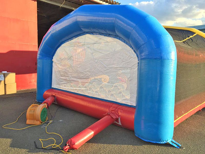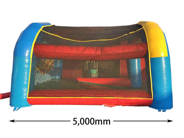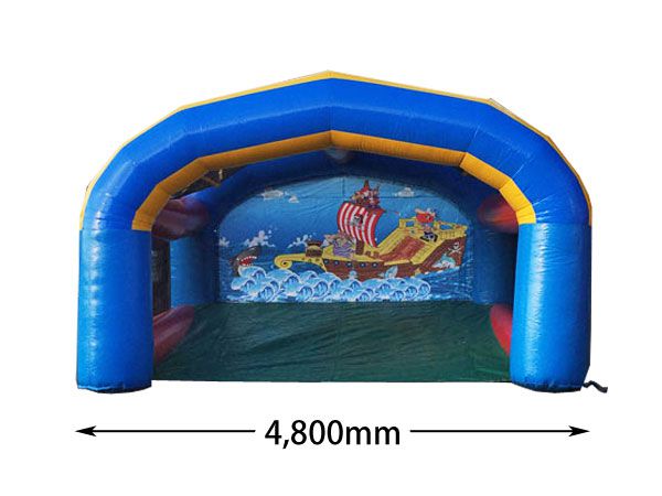 海賊エアゲージは、催し物やイベント会場で射的やボール投げ等、ゲームコーナーの周囲に飛んで行くと困る場合に、そのスペースを囲える商品です。幅は4.8m、奥行きは5mありますので、ゲームコーナーを作るには十分な広さとなります。囲うといっても、屋根部分は網状になっているため採光も十分取り入れられ明るいスペースです。弓道ゲームや的当てゲーム等と一緒にお使いいただけます。