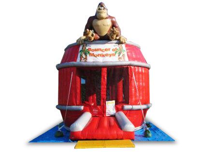 大きな樽型のエア遊具の上にはインパクト抜群の勇ましいゴリラの姿が!高さ5m以上もあるこちらのエア遊具は、成人男性でも小さく見えてしまうほどの大型エア遊具です。中はふわふわとしたトランポリンになっており、思いっきり高くジャンプしても大丈夫です。愛らしいお猿さんたちがプリントされた柱も立っており、楽しい雰囲気を作ってくれています。動物関連のイベントやファミリーイベントにいかがでしょうか。