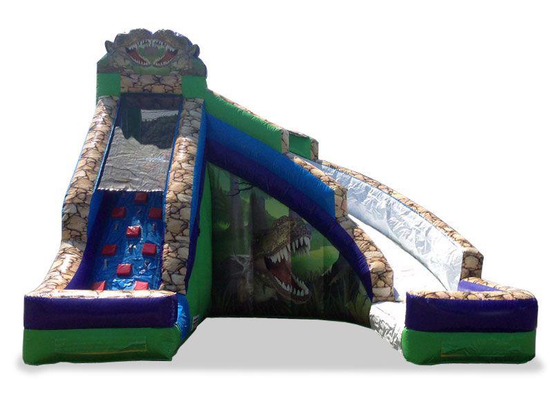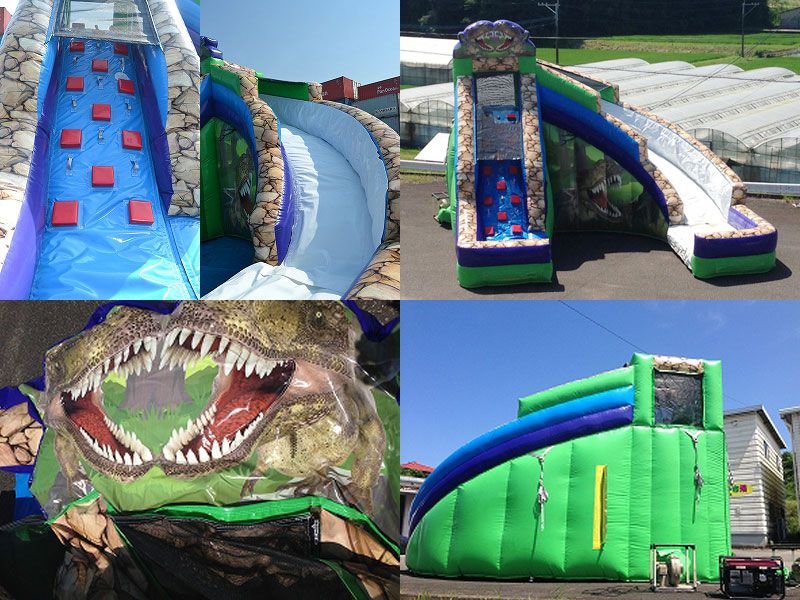 大きく口を開け、歯をむき出しにした恐竜がインパクト抜群の恐竜アスレチック滑り台のご紹介です!2匹の恐竜がいる頂上まで手と足をうまく使ってのぼって行き、滑り台でおります。少し小ぶりなスライダーなので、ショッピングモールや屋内のイベント会場でもご使用いただけますよ。設営も送風機で膨らませるだけなので簡単で時間もかかりません。子供達が多く集まるイベント会場で是非ご使用ください!