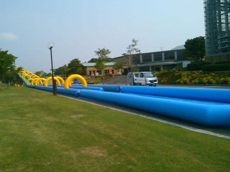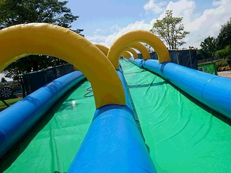 130mの超ロングなスライダー!プールに行かなくても楽しめる「130mハイドロスライダー」のご紹介です。設置はとても簡単で、場所さえ決まればあとは空気で膨らますだけ。傾斜があれば尚よいですが、平坦な場所でも可能です。浮き輪をご用意していただき、スライダーに水を流し、その勢いで滑ります。とにかくインパクト抜群なので集客効果も高く、夏の長期イベントにオススメ。大人から子供まで楽しめる商品です!