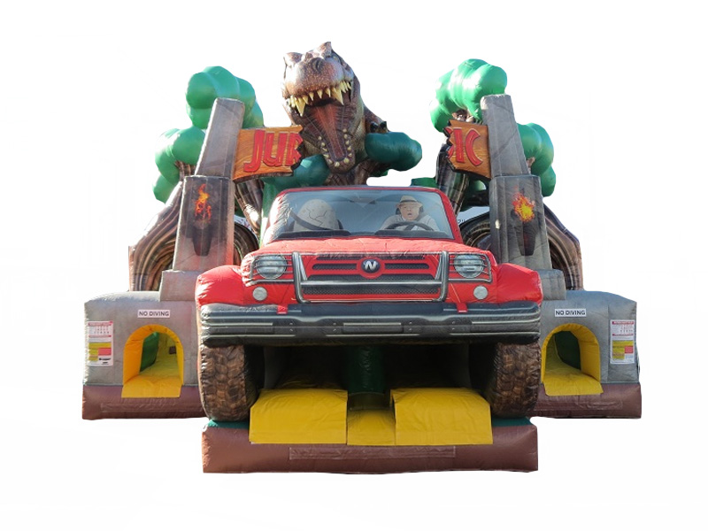 大迫力のスライダーエア遊具、「恐竜スライダー遊具」のご紹介です!逃げる車を追いかけるのは、恐竜の代名詞であるティラノザウルス。牙をむき出しにして襲い掛かろうとしている姿に、思わず尻込みしてしまう程の迫力がありますが、実はとても楽しいスライダー遊具。入り口は両サイドの2ヶ所になっており、スライダーの出口は車の下と、とてもユニークな作りです。恐竜大好き、車大好き!なお子さまにはたまらないエア遊具です!ご入用の際は、お気軽にお問い合わせください!