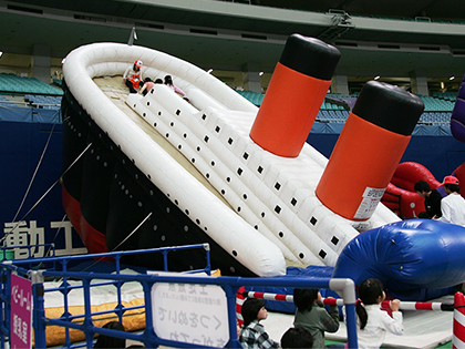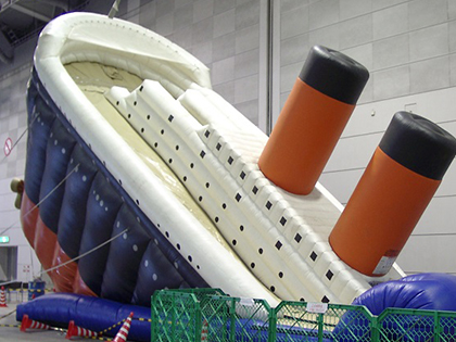 沈みかけた大きなクルーザーの迫力に、大人も子供も釘付け!「クルーザースライダー」のご紹介です。あのかの有名な映画のあの船だ!と思われる方も多いのではないでしょうか。本物の船にも劣らない、奥行き126m、高さ10mの超ビッグサイズの大型エア遊具です。商品の大きさに伴い、スライダー部分も長く角度も急で、何倍もの爽快感が味わえます!ご入用の際は、お問い合わせください。