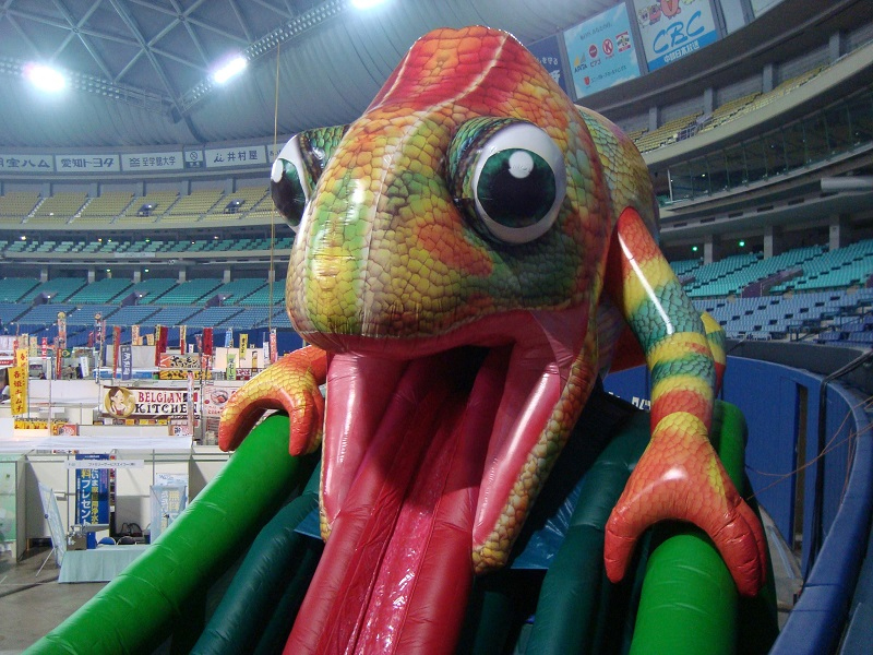 カラフルボディのカメレオンがスライダーになって登場!「エアースライダーカメレオン」のご紹介です。こちらの商品は、大きなカメレオンがとにかくとインパクト抜群!少し奇妙だけど、よく見るととてもきれいな色合いのカメレオンです。スライダー部分はなんと長く伸びた舌!舌先がクルンと巻いており、ストッパーとなりますので、勢いで外に飛び出しだしまう心配もありません。高さがあるので、スリルと爽快感が味わえちゃいます!