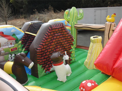ほっこりと温かな印象を与えてくれる「ファームエアーパーク」のご紹介です!木のお家の周りには、馬や牛、にわとりやアヒルなどたくさんの動物たちが描かれており、とてもほんわかした印象です。中にも可愛いオブジェやスライダーがあり、色々な遊び、楽しみ方ができますよ。酪農関連のイベントや住宅展示場にぴったりなエア遊具です!