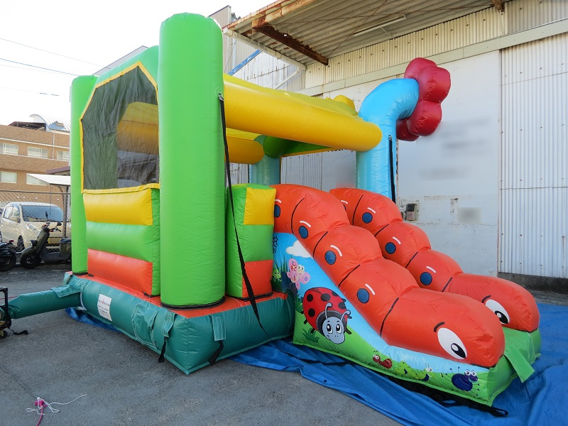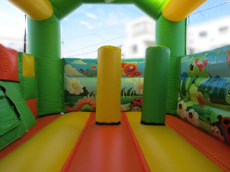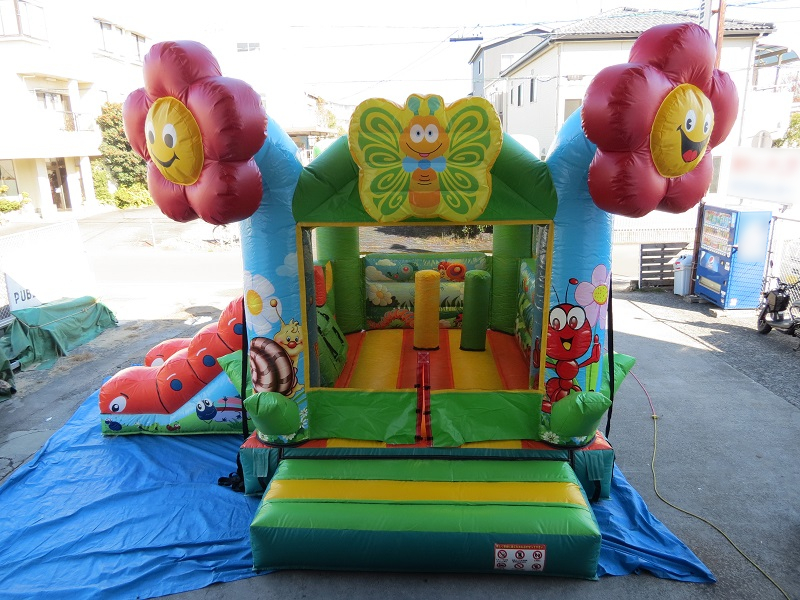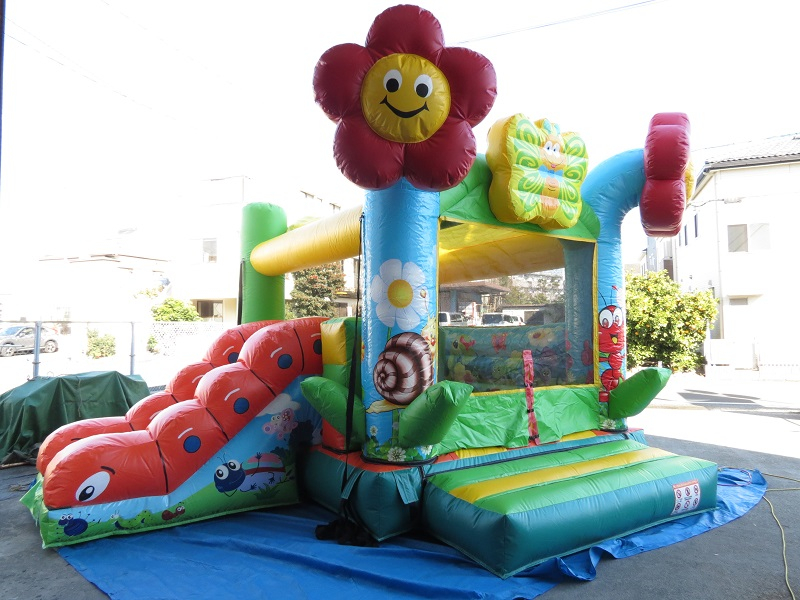 入り口でお迎えする大きな可愛いお花のオブジェ!「ガーデン型プレイランド」のご紹介です。チョウチョのオブジェやいもむしスライダー、壁にはてんとう虫やお花などがたくさん描かれており、春の暖かさや陽気な雰囲気をを感じるエア遊具です。お子さんに人気間違いなしのこちらの商品、是非イベントにご利用ください!