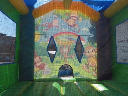 南国の陽気な雰囲気漂うバウンサー!「おさるさんバウンサー」のご紹介です!突き出たヤシの木と、大きなバナナ、そして楽し気なおさるさん達がデザインされたこちらの商品。幅、奥行き、高さのすべてが5m以内と、小ぶりなサイズのバウンサーですので、スペースに余裕が無い場所でも設置可能です。宣伝活動や、集客イベントなどでお話している間に、お子さんが遊べるちょっとしたスペースを確保しておくと、しっかりPRもできますね!ご入用の際は、お気軽にお問い合わせください!