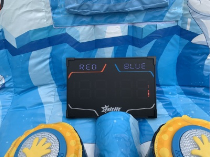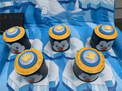 ペンギンの頭をタッチ!「ペンギンボタンタッチゲーム」のご紹介です。赤組と青組に分かれて対戦するこちらのゲーム。ペンギンの頭にあるボタンが赤・黄・青にランダムに光り、赤組の人は赤に光った時に、青組の人は青に光った時に上手くタッチすると得点が入ります。間違って相手の色をタッチしてしまうと、相手の得点になってしまいますのでご注意を!黄色はどちらの得点にもなりません。イベントに何か盛り上がる催しをとお考えでしたら、是非取り入れてみてください。ご利用お待ちしております!