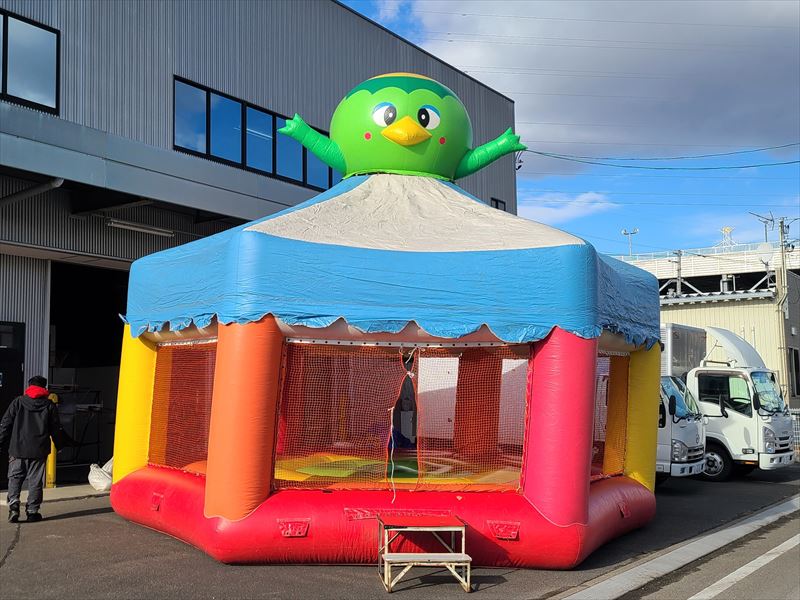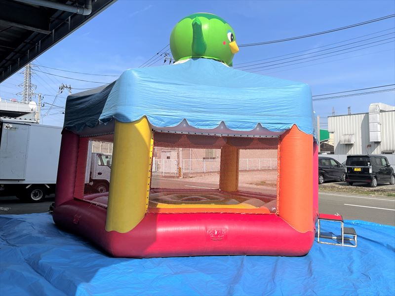 その名の通り、架空の生物・カッパがモチーフになっているカッパエアハウスのご紹介です。カッパといえば、主に怪談作品に登場することが多いので、人によっては怖い生物だというイメージが強いかもしれません。しかし、こちらの遊具のカッパはとても可愛らしい見た目とポーズをしているので、お子様達も大喜び間違いなしですよ!また、内部はカッパの下半身が天井から下に出ているといった細かい造りになっている他、側面にはネットが張られていて通気性が良く、親御さんも内部の様子を把握できて安心です。お子様が多く集まるイベントにとてもピッタリの遊具ですので、是非ご利用下さい!
