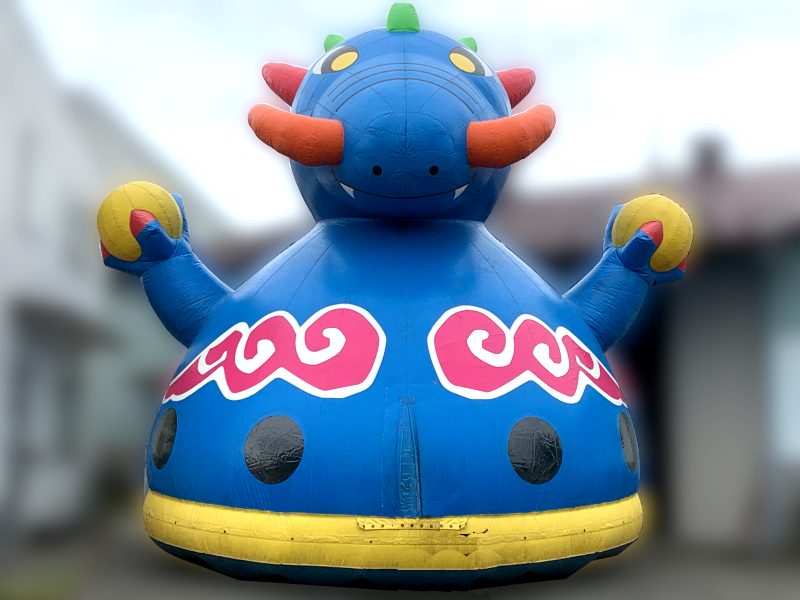 ファンタジー作品などで大人気のドラゴンが大きなエアー遊具になって登場!ドラゴンドームのご紹介です。神々しくて格好良いイメージが強いドラゴンですが、こちらはファンタジー作品のようなドラゴンとは打って変わって、にこやかな表情をしているのが特徴です。また、両手をこちらに向けて振っているようなポーズをしているなど、お子様達にも親しみを持ってもらいやすいデザインになっております。直径が5,500mm、高さが6,000mmと大きいので、数人のお子様が一度に入って遊ぶことができる他、アイキャッチ効果も大いに期待できます!お子様向けのイベントや、動物に関するイベントの会場などに是非いかがでしょうか。