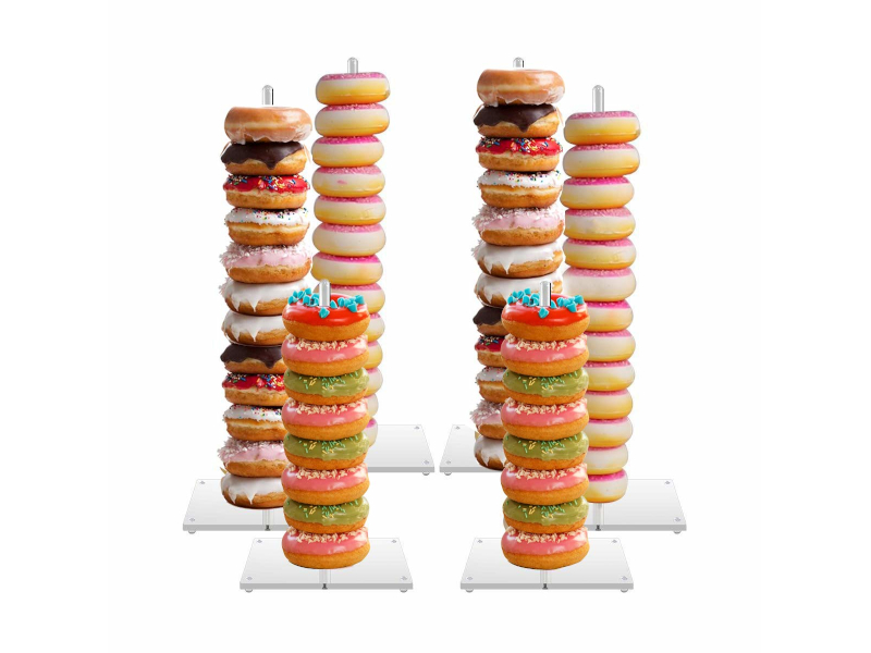 ドーナツをおしゃれにディスプレイ!「ドーナツホルダー」のご紹介です。こちらの商品は、画像のようにドーナツを積み重ね、ドーナツタワーを作ることができる商品です。シンプルなドーナツはもちろんですが、可愛くデコしたドーナツを重ねると、さらにインパクトのあるディスプレイが可能です。ドーナツ以外にも、ベーグルなどの輪の形の食べ物でしたら対応可能です。ご入用の際は、お気軽に弊社までお問い合わせください!