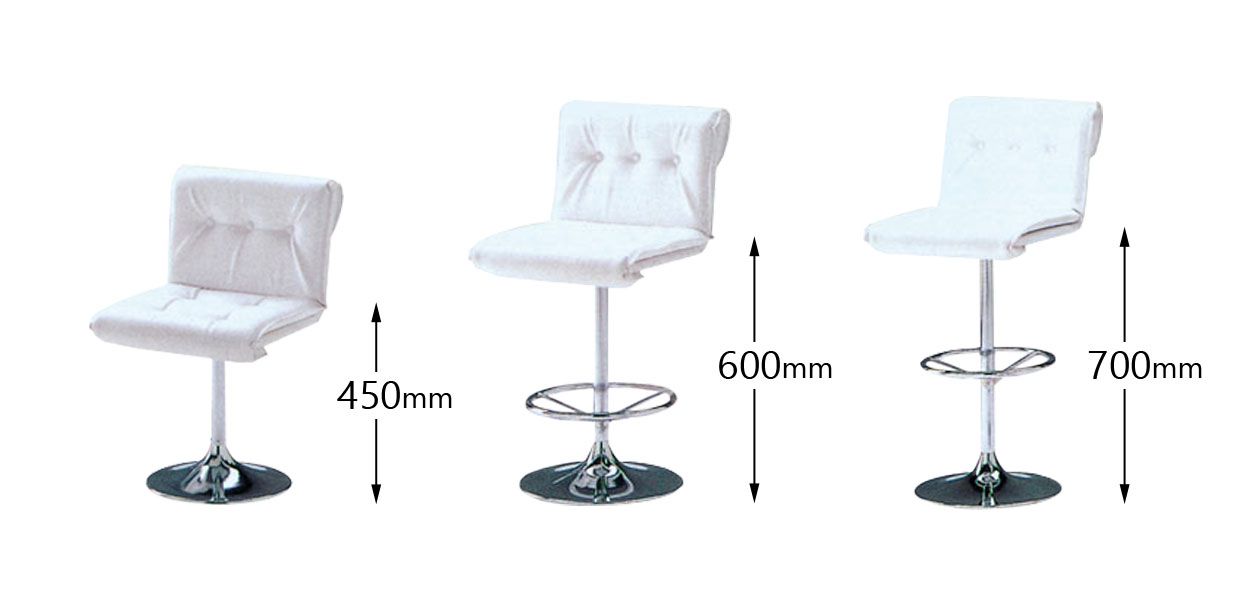 ふわふわのクッション性が心地よいクッションバーチェアのご紹介です。バーやラウンジで見かけるような椅子で、高さは3タイプあります。高さは45cm、60cm、70cmの3種類ご用意しています。高さが調節可能な椅子ではありませんので、お使いになる場所をご確認ください。バーやラウンジ以外に、内輪のパーティーやお祝い事等のイベントなどにお使いいただくことももちろん可能です。
