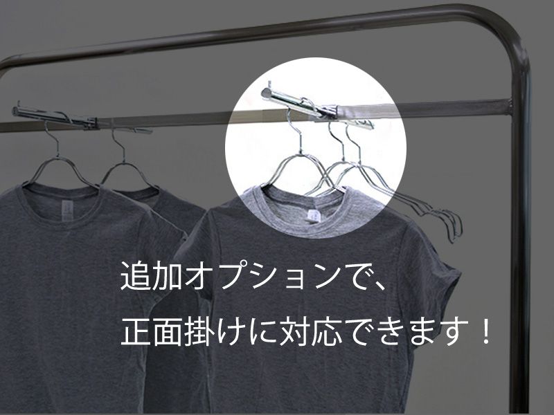 アパレル業界での新作発表会やポップアップショップに、こちらのシンプルなハンガーラックはいかがでしょうか。無駄を省いたこびないデザインはお洋服のジャンル、会場の雰囲気を問わずお使いいただけます。また、追加オプションの正面掛け用のフックを付けていただくと、お洋服を正面からディスプレイでき、お客様にダイレクトに伝わります。横掛けと正面掛けを組み合わせて展示いただくとより商品アピールに繋がります。