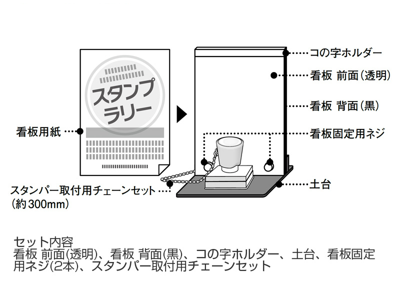 看板前面(透明) 看板背面(黒) コの字ホルダー 土台 看板固定用ネジ×2本 スタンパー取付用チェーンセット |