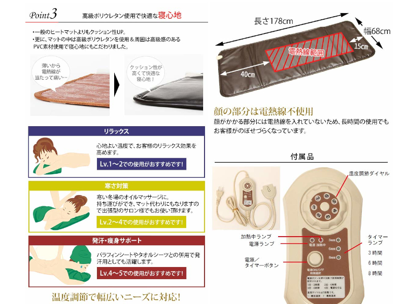 マッサージベッドでの施術の際におすすめ!「ホットマットベッド」のご紹介です。こちらの商品は、7段階で温度調節ができ、リラック効果、寒さ対策、発汗サポートなど、ご希望に合わせてお好みの温度でお使いいただけます。寝心地抜群のクッション性で、顔が当たる部分には電熱線を入れていないため、長時間使っても顔が火照ったり、のぼせたりしにくくなっております。また、撥水素材なので、リンパマッサージの際のオイルや、水や汗もサッとふき取ることができます。折りたたみもでき、持ち運びにも便利!ご入用の際は、お気軽に弊社までお問い合わせください。
