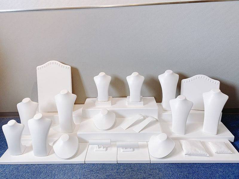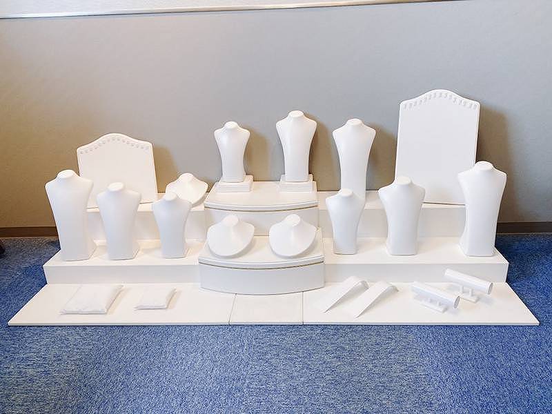 トルソーや指輪展示スタンドなどがセットになったアクセサリー展示セット レンタルのご紹介です。一つ一つの展示スタンドを頼んでいては時間もかかるし管理が大変、そんな時に便利な一式のセットです。リングタイプ、トルソータイプ、トータルタイプの3種類がございますので展示物の数や種類によってお選びください。