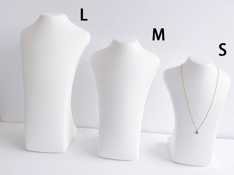 ネックレスを飾るのに最適な首部分のみのネックトルソー レンタルのご紹介です。大小さまざまなサイズがあり、ネックレスを掛けれディスプレイする際などに使われるもので、首部分の形を再現しているので実際につけたように展示することができ、縦に長いので多少長さのあるネックレスも展示可能です。