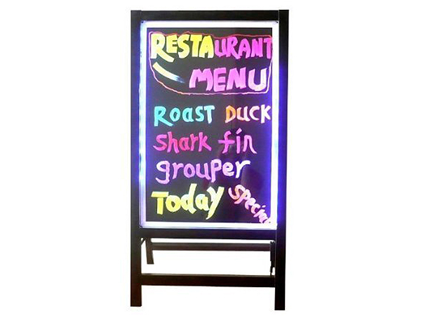 描いた文字がとてもよく目立つ!LED掲載の「光る手書き看板」のご紹介です。専用のカラーペンで、お店のメニューやアピールしたい内容をお好きなように描いていただき、LEDライトをオンすると、まるで文字が光っているかのように目立ちます。書き直したいときは、簡単に水拭きで落とせますので、日替わりのランチメニューなど、頻繁に変更しなくてはいけない時にも便利です。夜間や薄暗い場所ではより目立ちますので、集客効果も期待!ご入用の際は、お気軽に弊社までお問い合わせください!