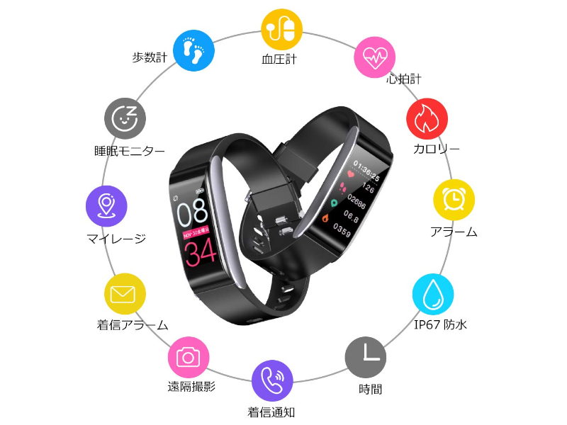 心拍計、血圧測定、活動量計、歩数計、距離測定、睡眠モニター、座りすぎ注意、アラーム、カロリー消費など |