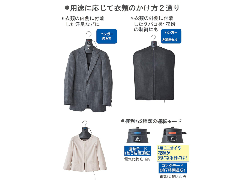 忘年会や新年会など、飲み会やお食事の場で付いてしまった臭いの解消に、こちらの「ナノイーX搭載ハンガー」を是非ご利用ください!タバコや焼き肉のきつい臭いがスーツやコートに付いてしまっても、毎日のようにクリーニングに出せるわけではありません。こちらの商品は、消臭効果のあるナノイーXを搭載したハンガーで、帰宅後ハンガーに掛けておくだけで臭いを分解し脱臭、花粉も抑制してくれます。通常モードに加え、特に臭いが気になる時は、ロングモードでご使用ください。お問い合わせをお待ちしております!