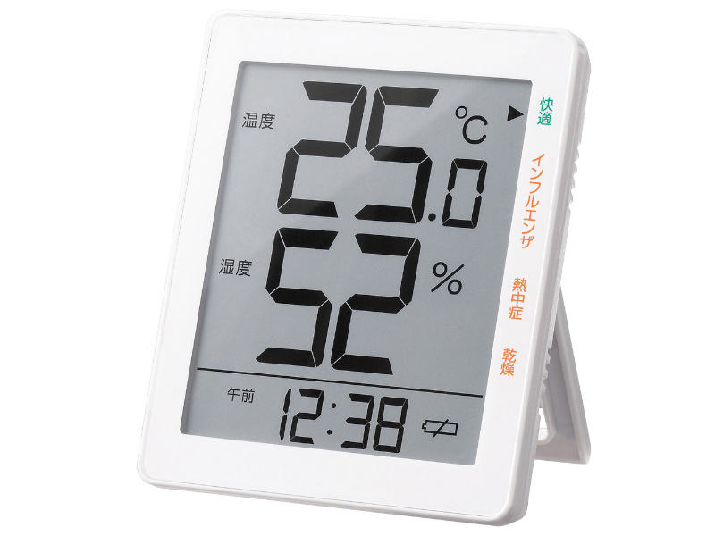 暑い時期の熱中症対策や、乾燥シーズンのインフルエンザ予防に役立つ置き掛け兼用デジタル温湿度計のご紹介です。前面アクリル仕様のデザインで、液晶画面には上から順に温度、湿度、時刻が表示されています。表示サイズが大きいため、少し離れた場所からでも温度や湿度を しっかりと確認できますよ!またその名の通り卓上に置いたり壁にフックなどを付けて掛けたりなどできるので、置き場所にも困りません。作業現場などでの温湿度管理をしっかりして、快適な空間作りを心掛けましょう!