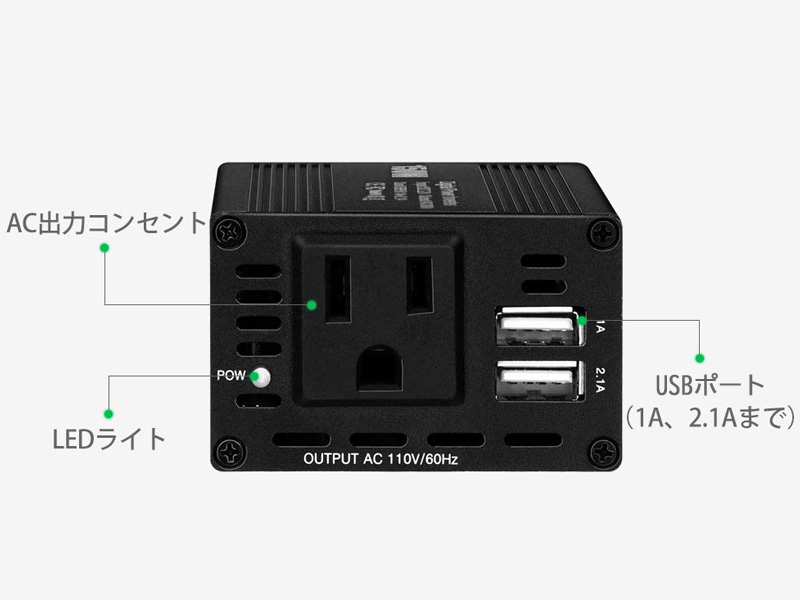 | 出力ポート | 1A USB×1、2.1A USB×1、ACコンセント |