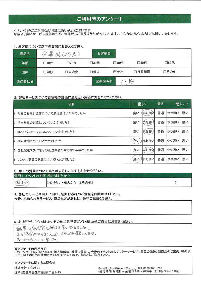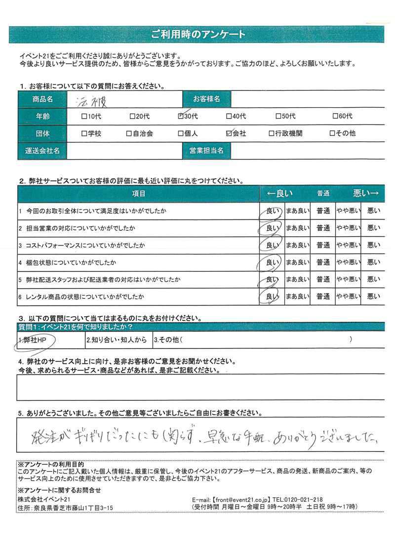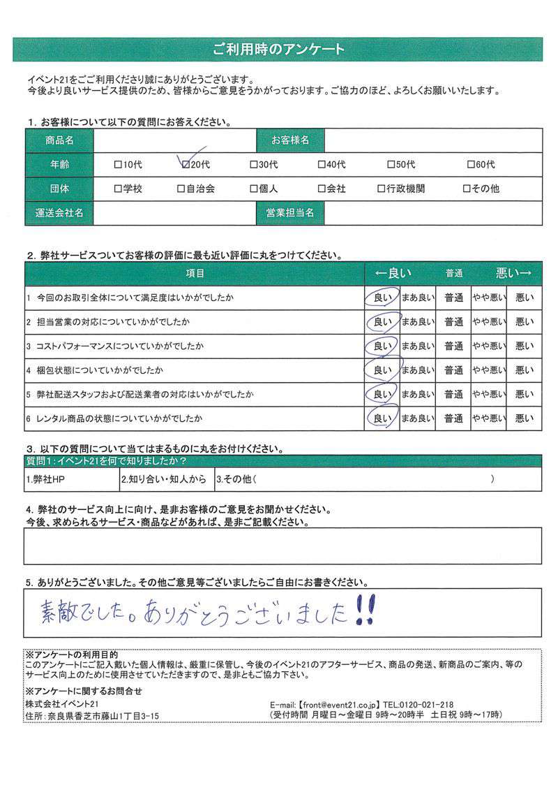 <株式会社イベント21> 本社:奈良県香芝市藤山1-3-15 配送センター:奈良県葛城市竹内811 TEL / 0745-77-6882 FAX / 0745-77-6981 front@event21.co.jp