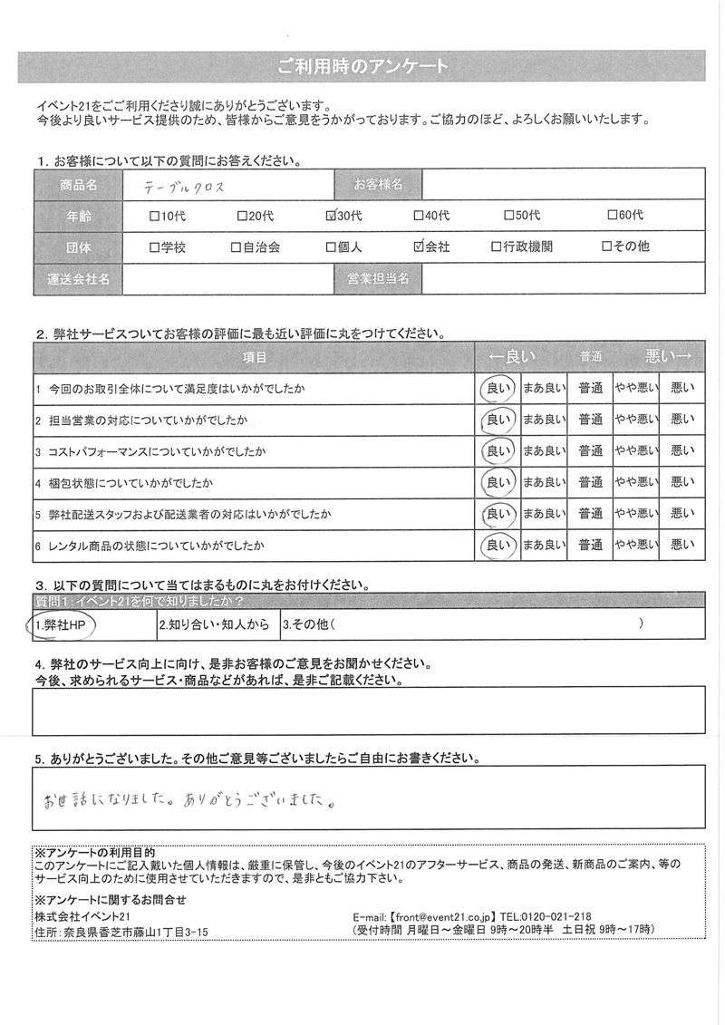 ありがとうございました。またテーブルクロスなど商品ご利用の機会がございましたら、ご連絡いただければ幸いです!