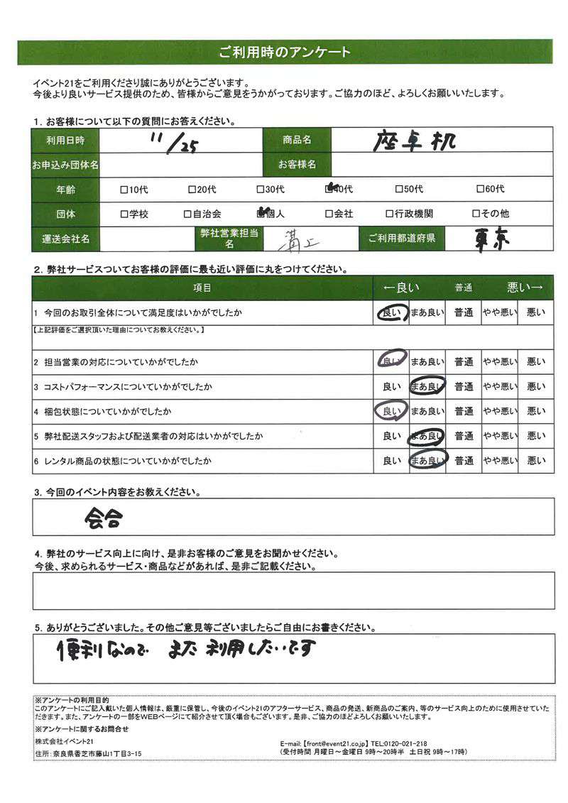 ご利用いただき、ありがとうございました!お客様からアンケートをいただけたのは今回が初めてのことですので大変嬉しく思います。