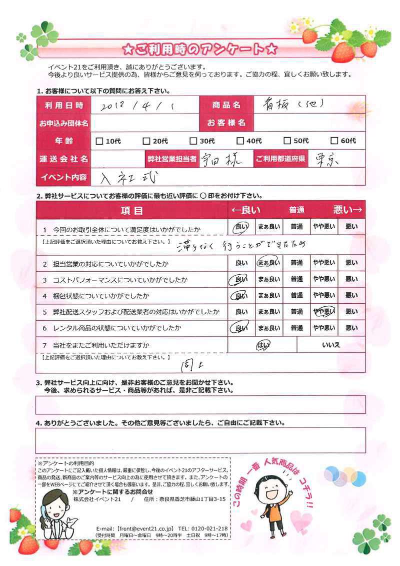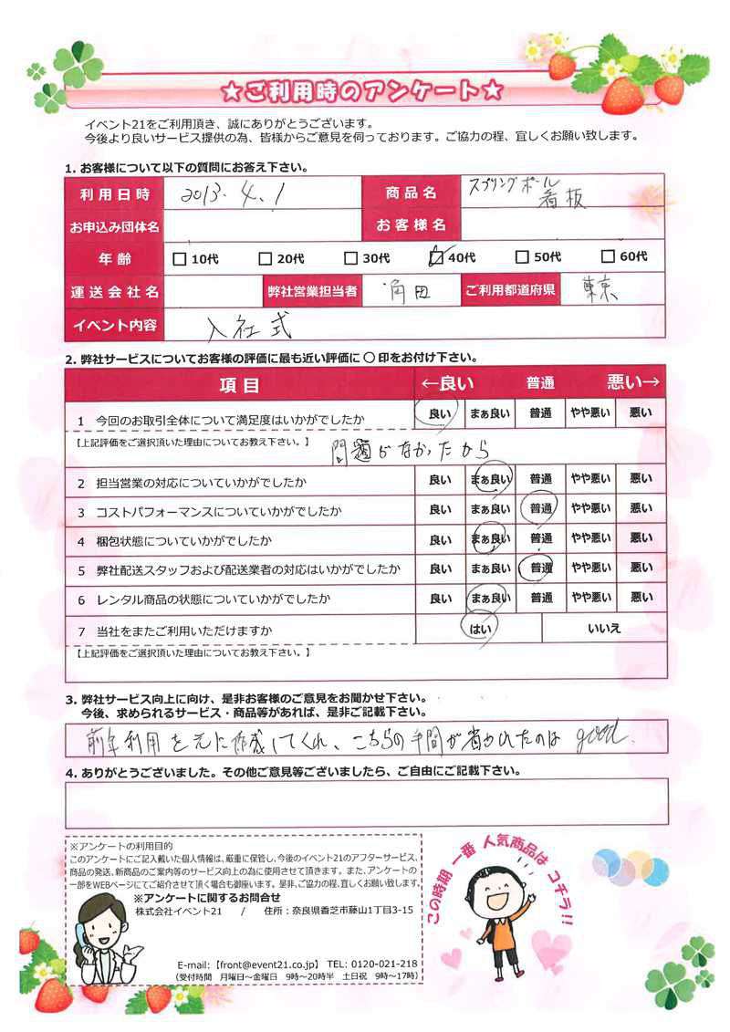 毎年ご利用いただきありがとうございます!当社もデータ残っており、スムーズにご対応させていただき、大変感謝しております。入社式の看板以外での数多くの物品取り揃えておりますので、お気軽に御連絡ください。