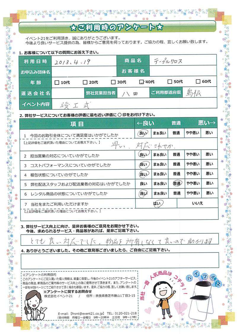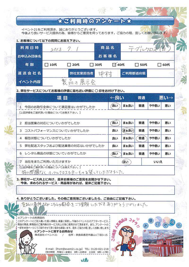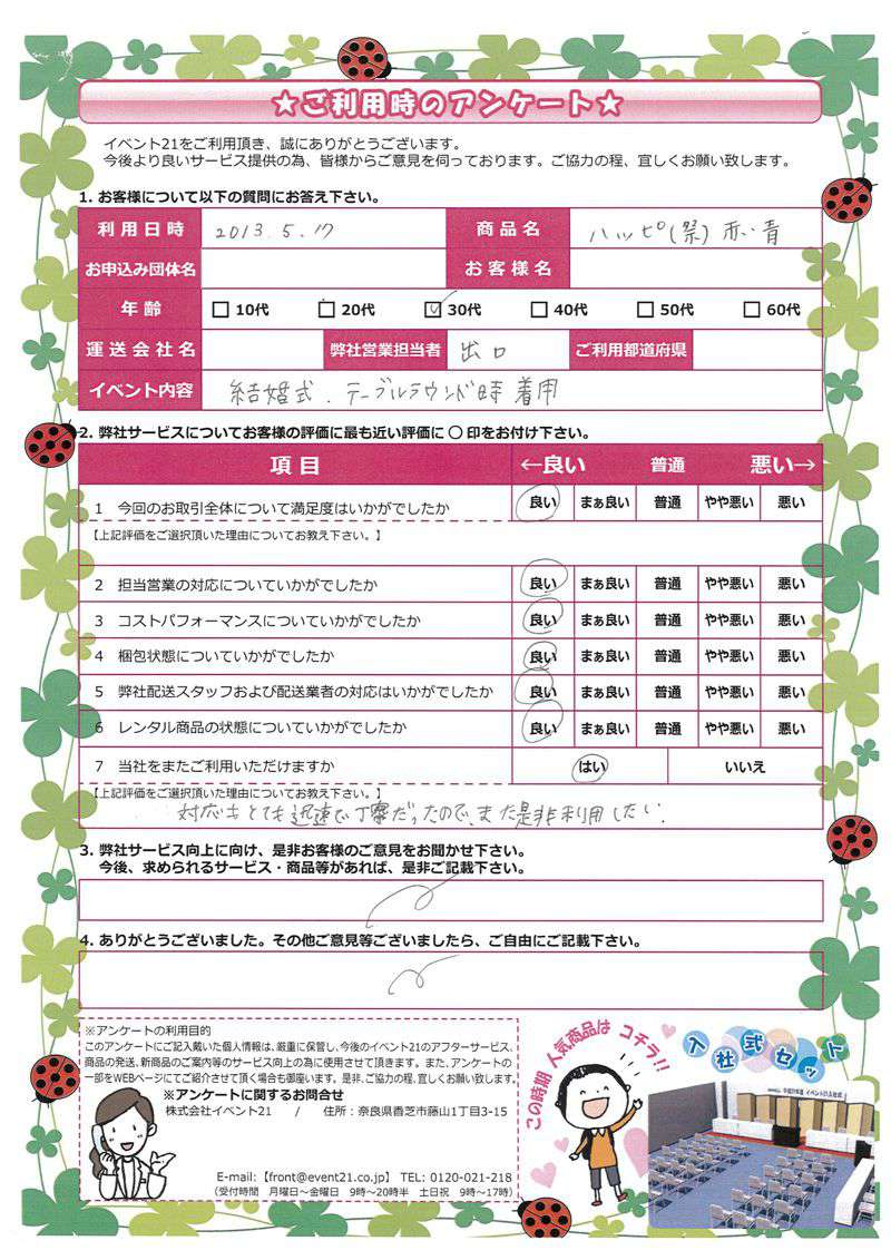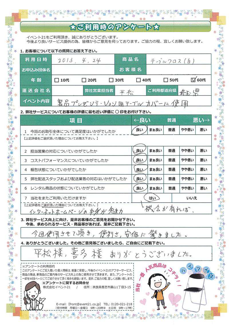 いつもお世話になっております。この度は弊社のテーブルやクロスなどをご利用いただきまして誠にありがとうございました。又ご機会がありましたら、いつでもお声掛けくださいませ。今後ともよろしくお願いします。
