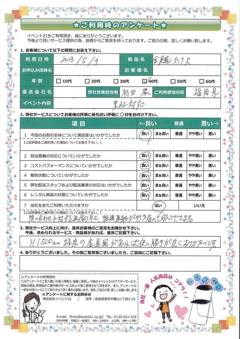 株式会社イベント21 前川様 お世話になっております。 8日はおかげさまで無事行事を済ませることができました。 昨日運送会社にパイプイス引き取っていただきました。