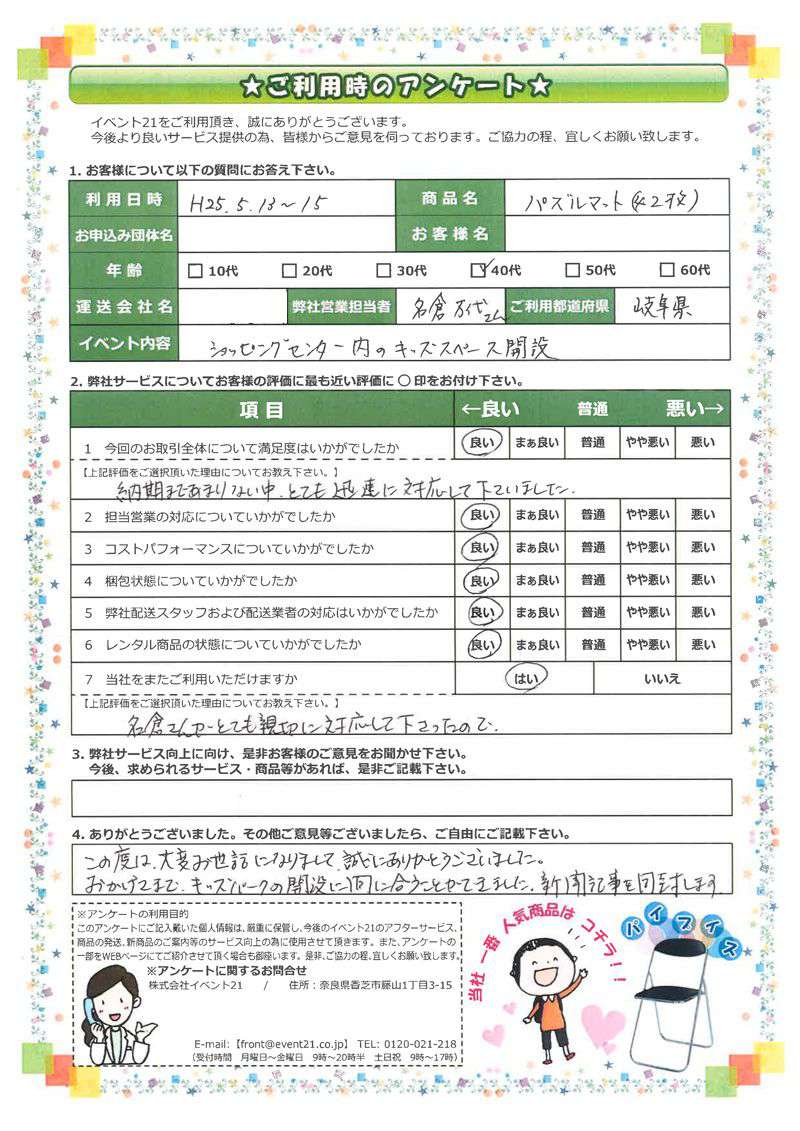 この度はパズルマットのレンタルをしていただき、誠にありがとうございました。イベントが成功したようで本当に嬉しいです。 また、ご利用いただける場合は、是非名倉までよろしくお願い致します。