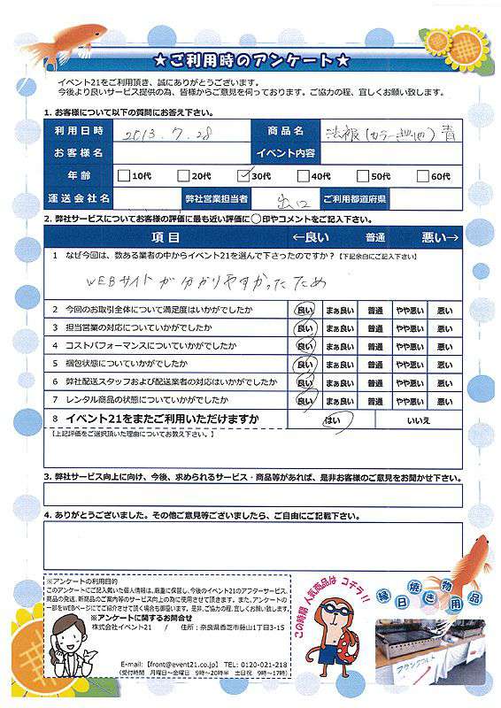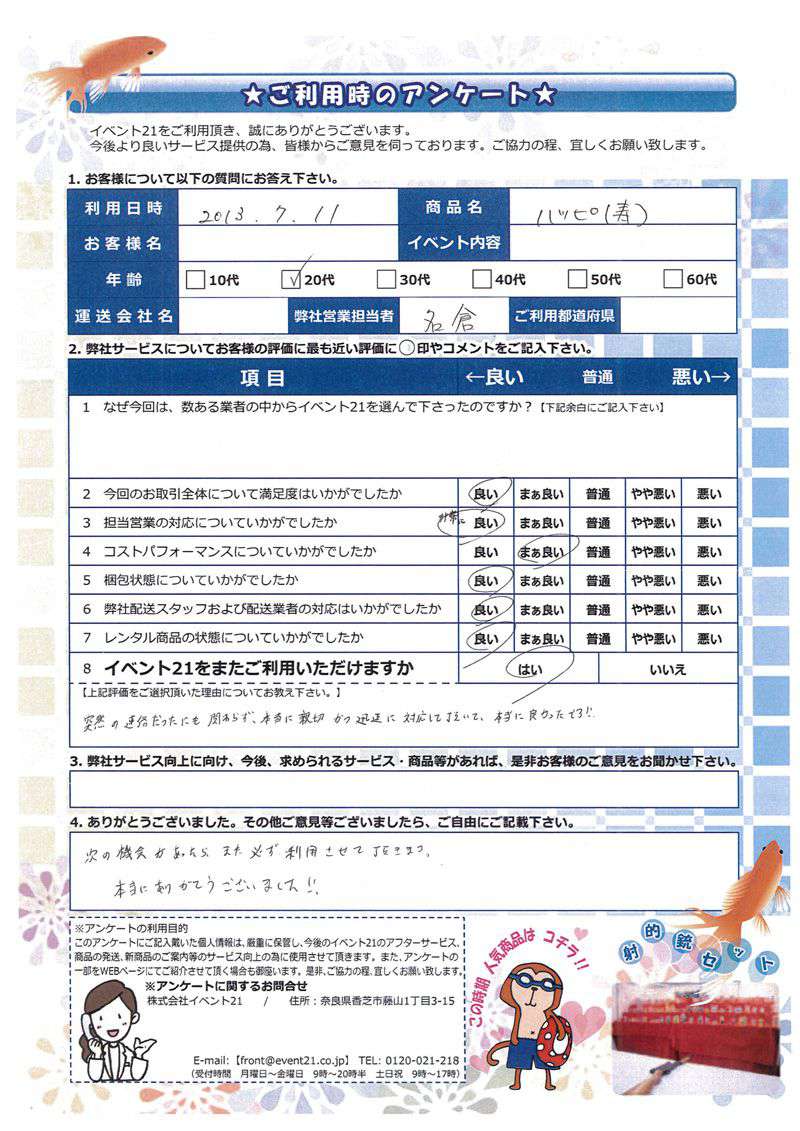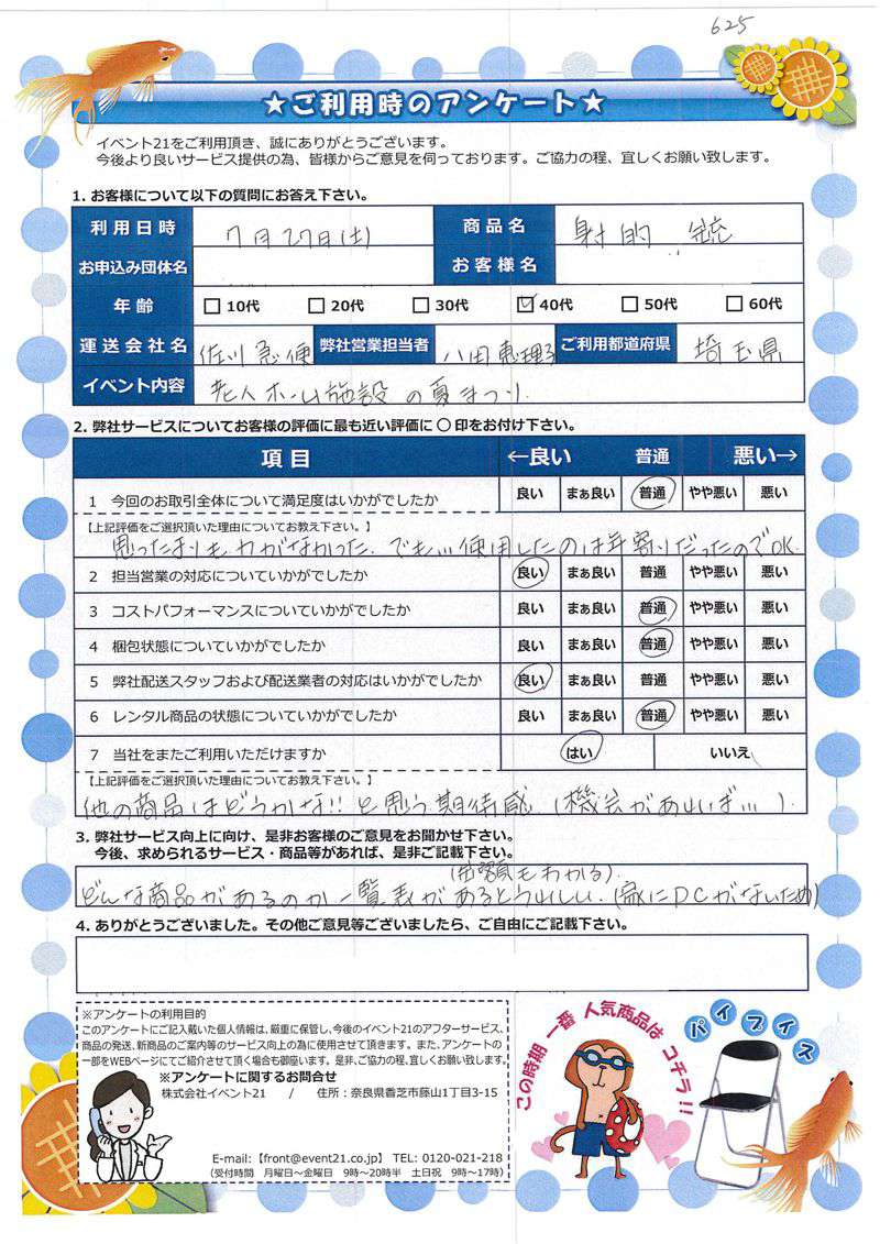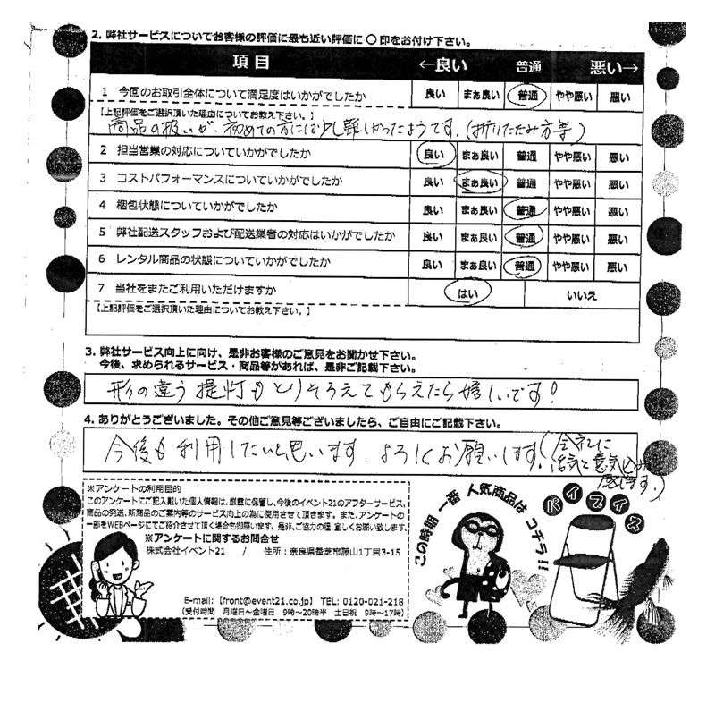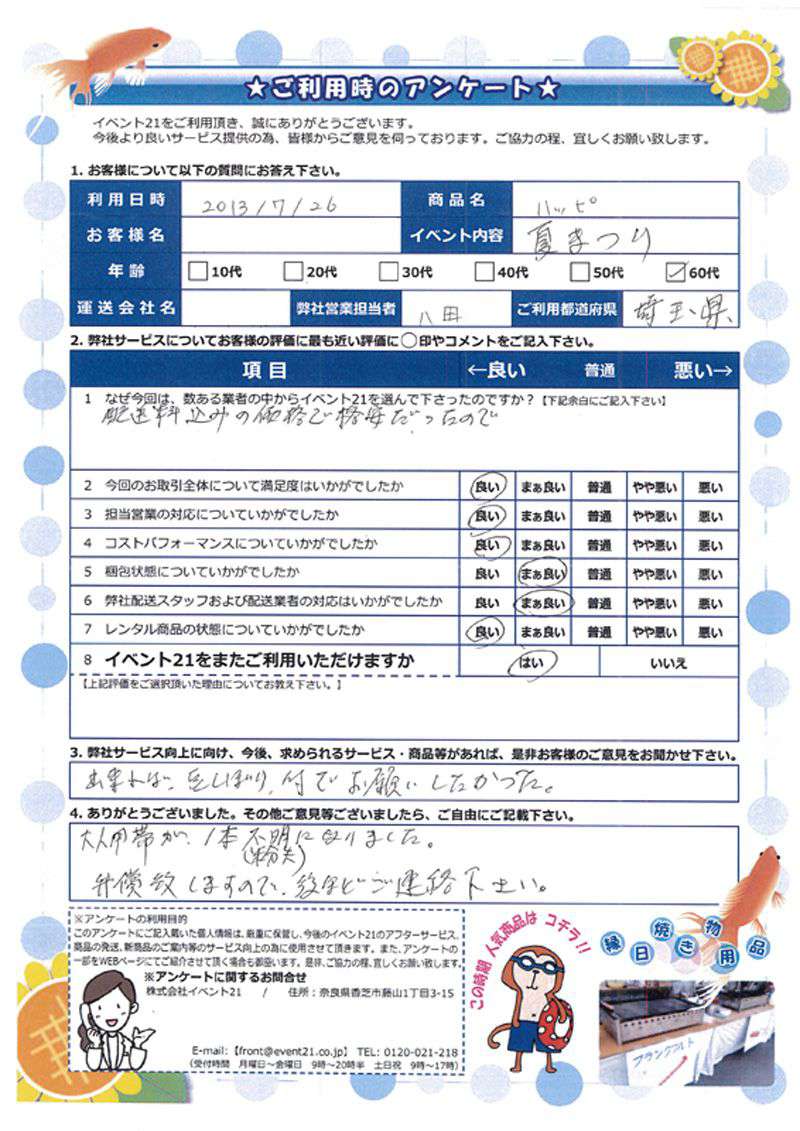 お店のイベントに弊社の商品を活用していただけたようで、安心致しました。ありがとうございました。 次回のご利用がございましたら、是非お声かけくださいませ。