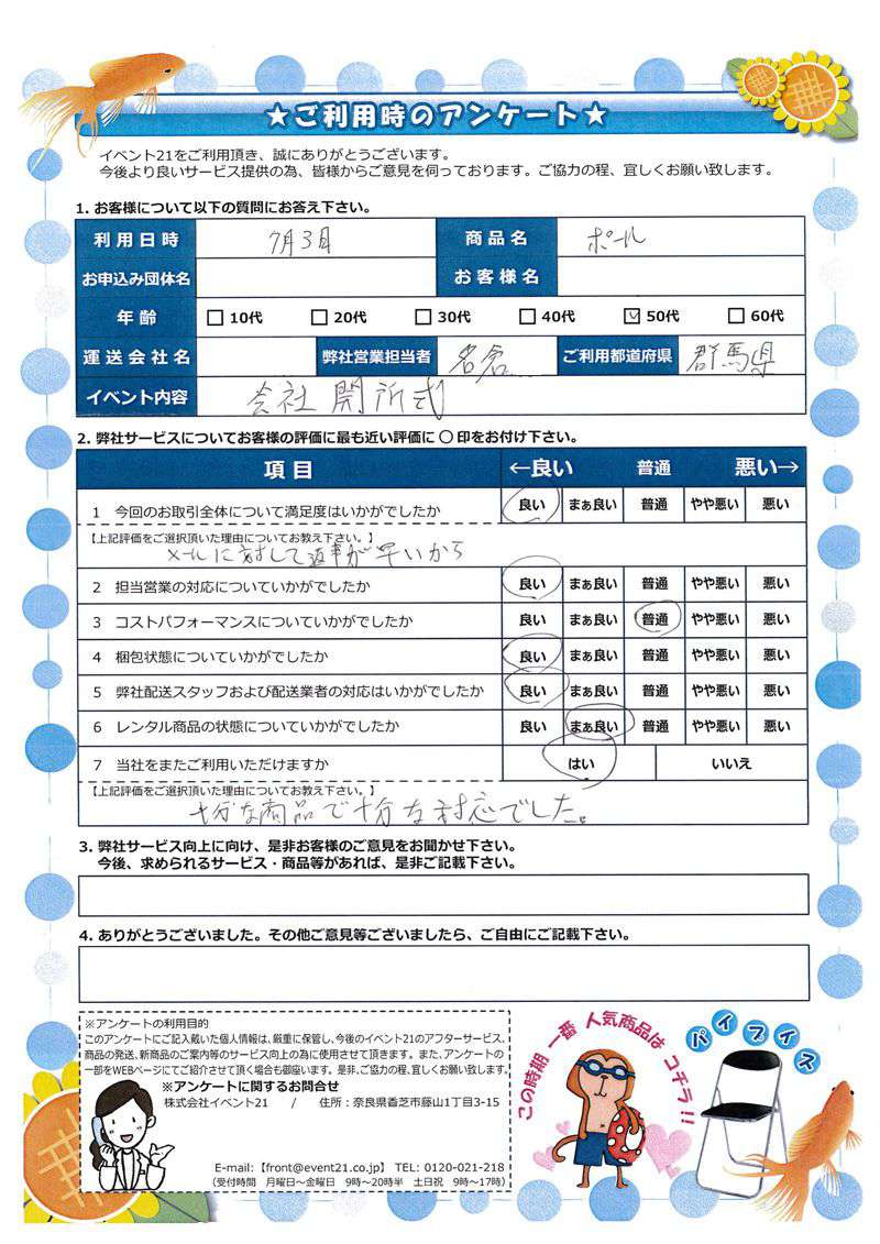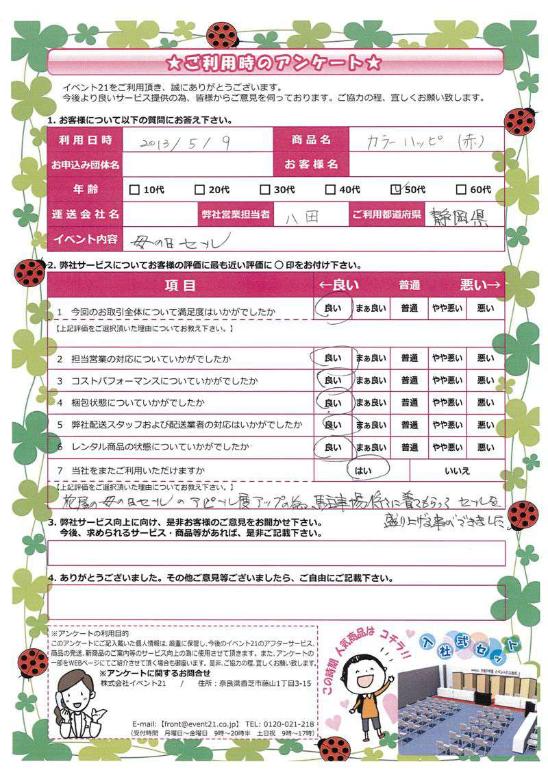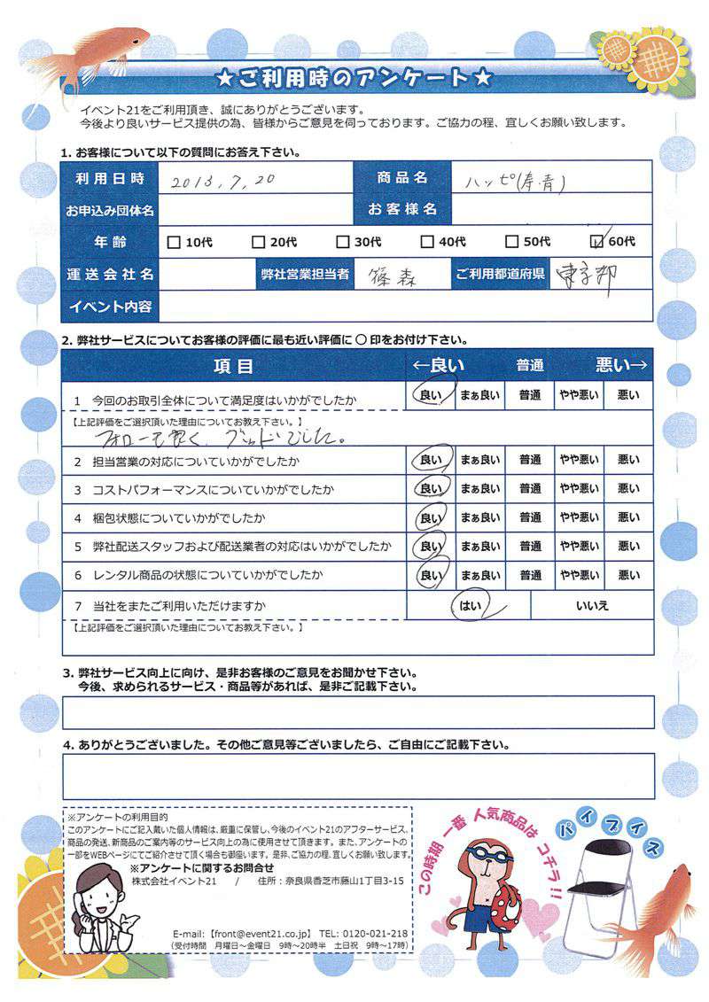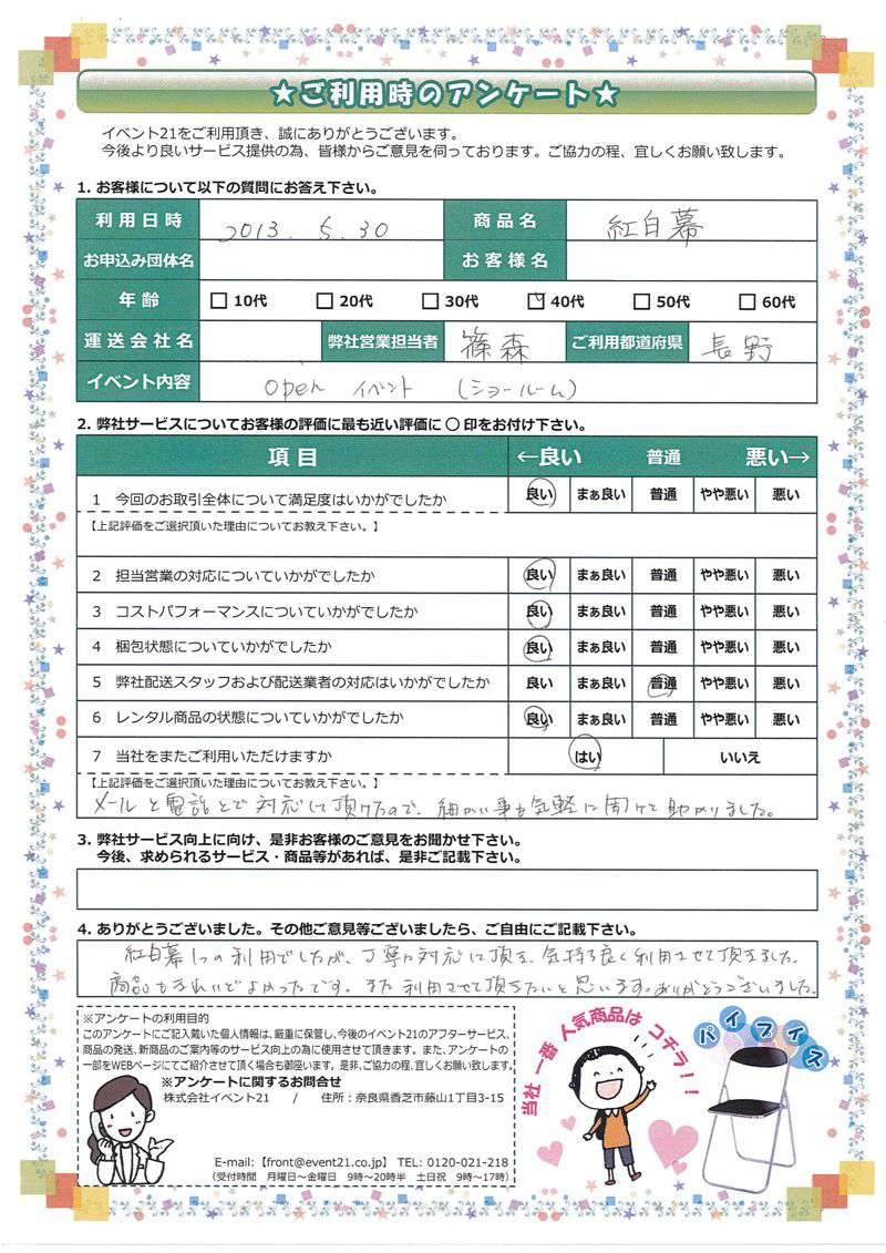 お店のイベントに弊社の商品を活用していただけたようで、安心致しました。ありがとうございました。 次回のご利用がございましたら、是非お声かけくださいませ。