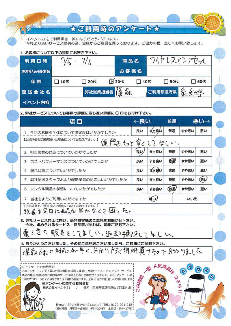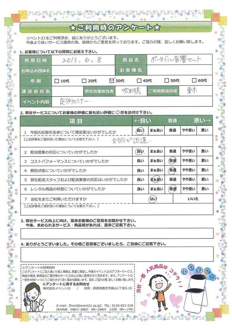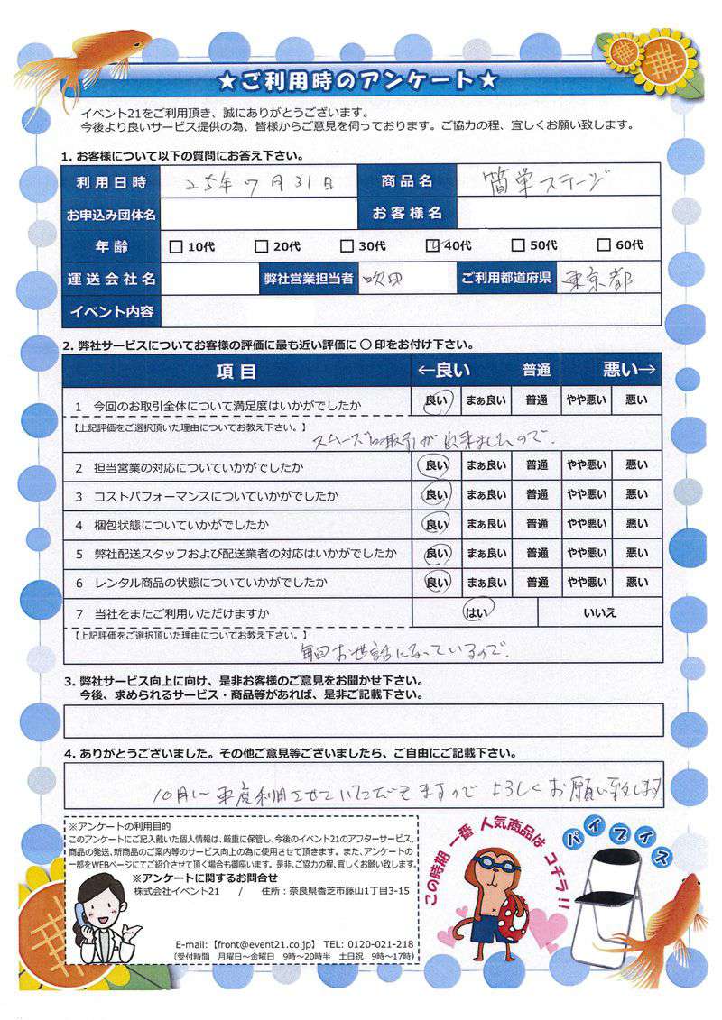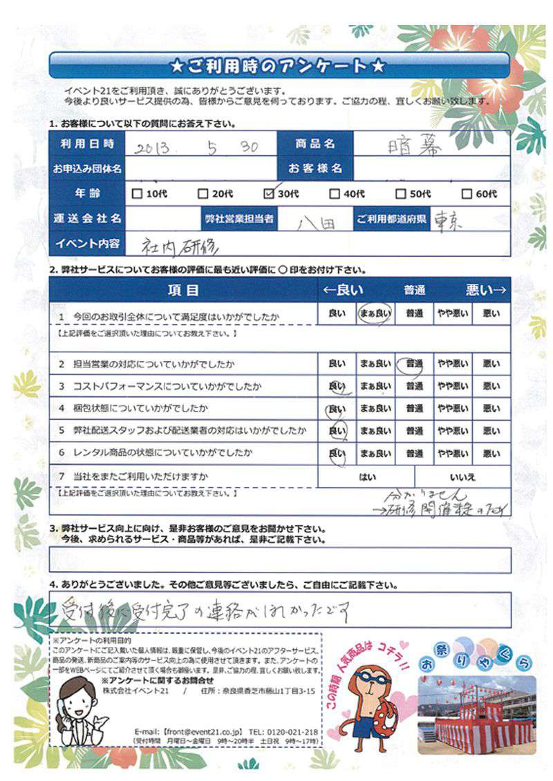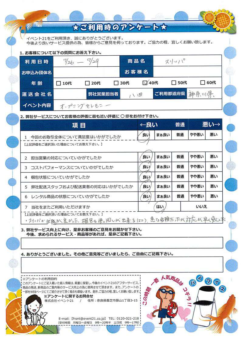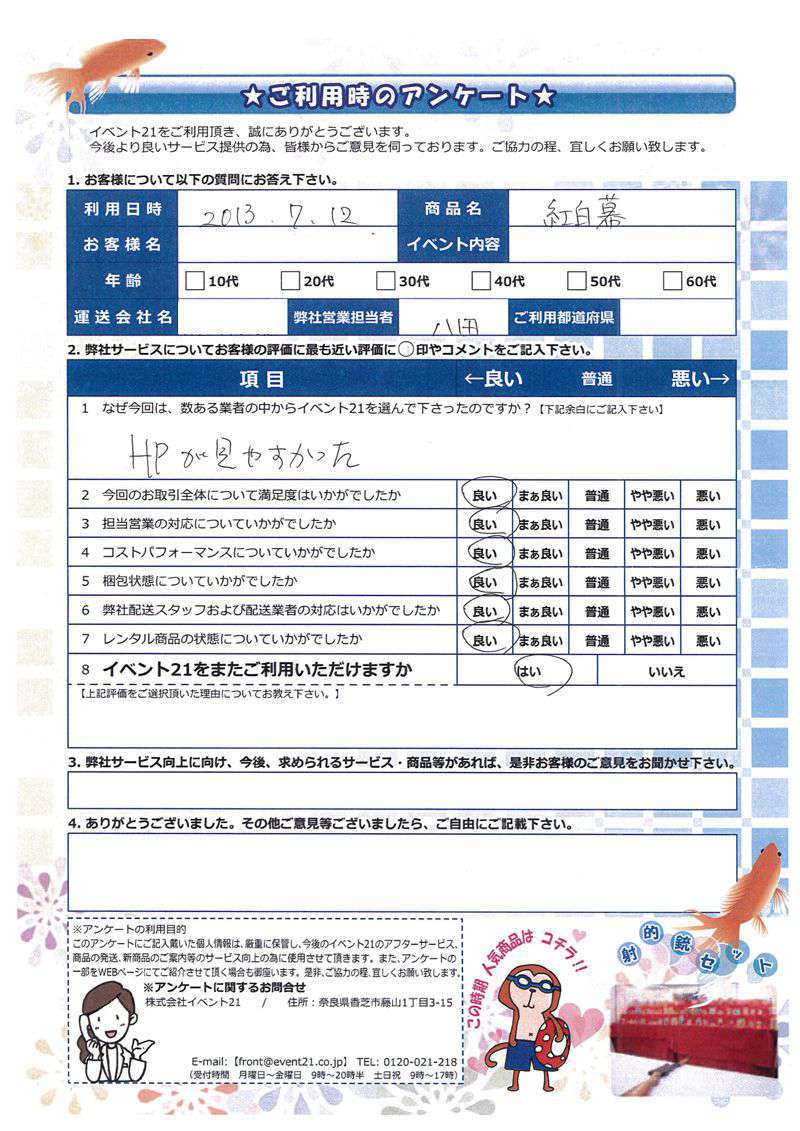 この度はご利用いただき誠にありがとうございました。アンケートでいただいた内容を参考に、以後役立たせて参ります。 またのご利用お待ちしております。