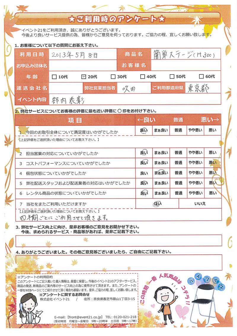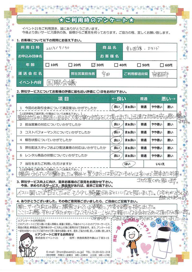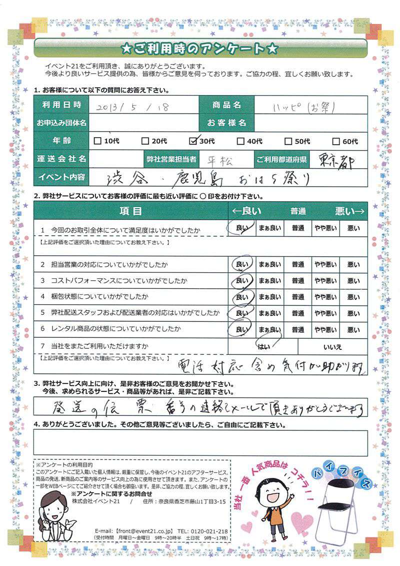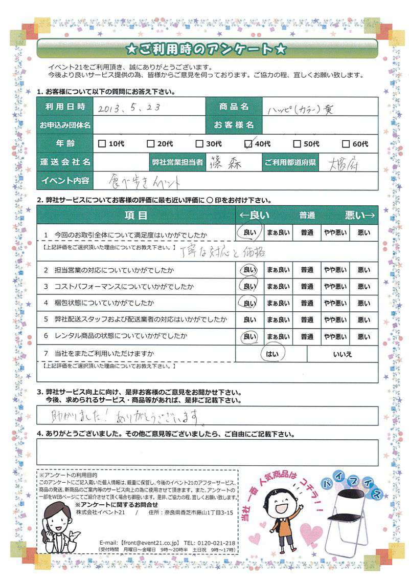 <株式会社イベント21> 本社:奈良県香芝市藤山1-3-15 配送センター:奈良県葛城市竹内811 TEL / 0745-77-6882 FAX / 0745-77-6981 front@event21.co.jp