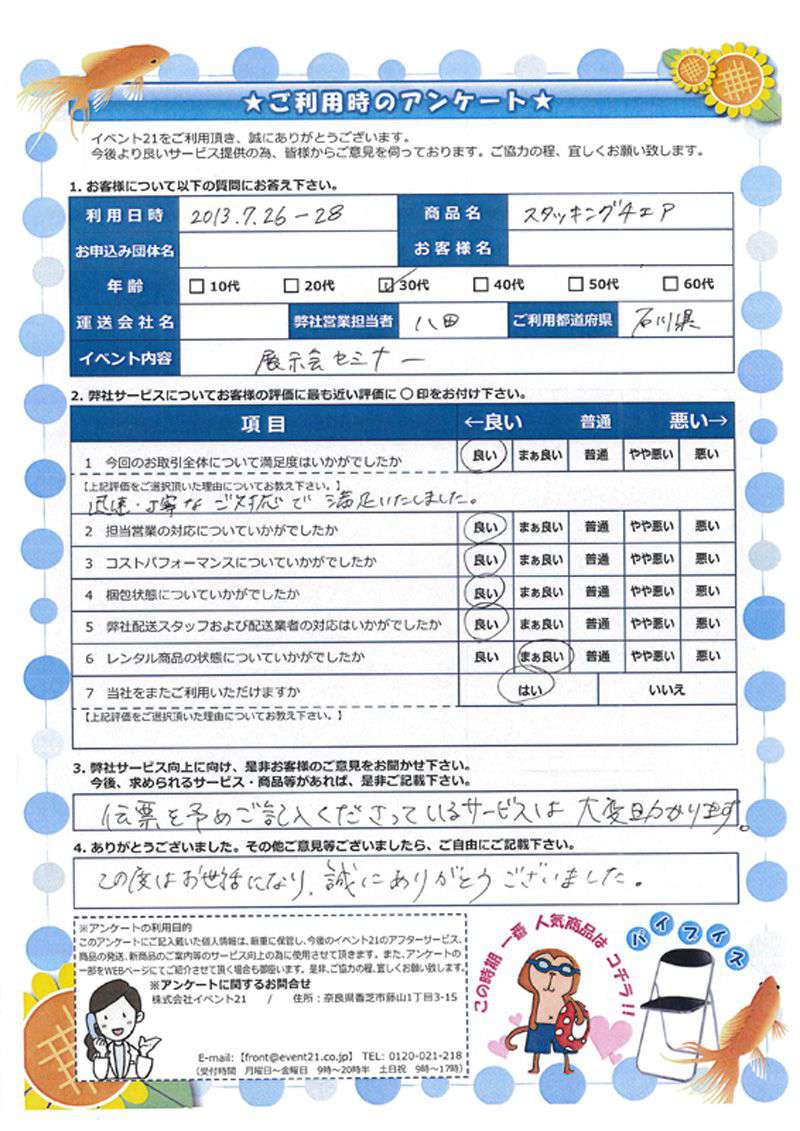 2013年7月にご利用いただいた30代石川県のお客様より