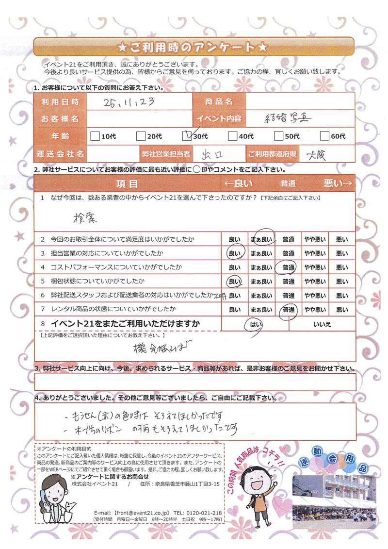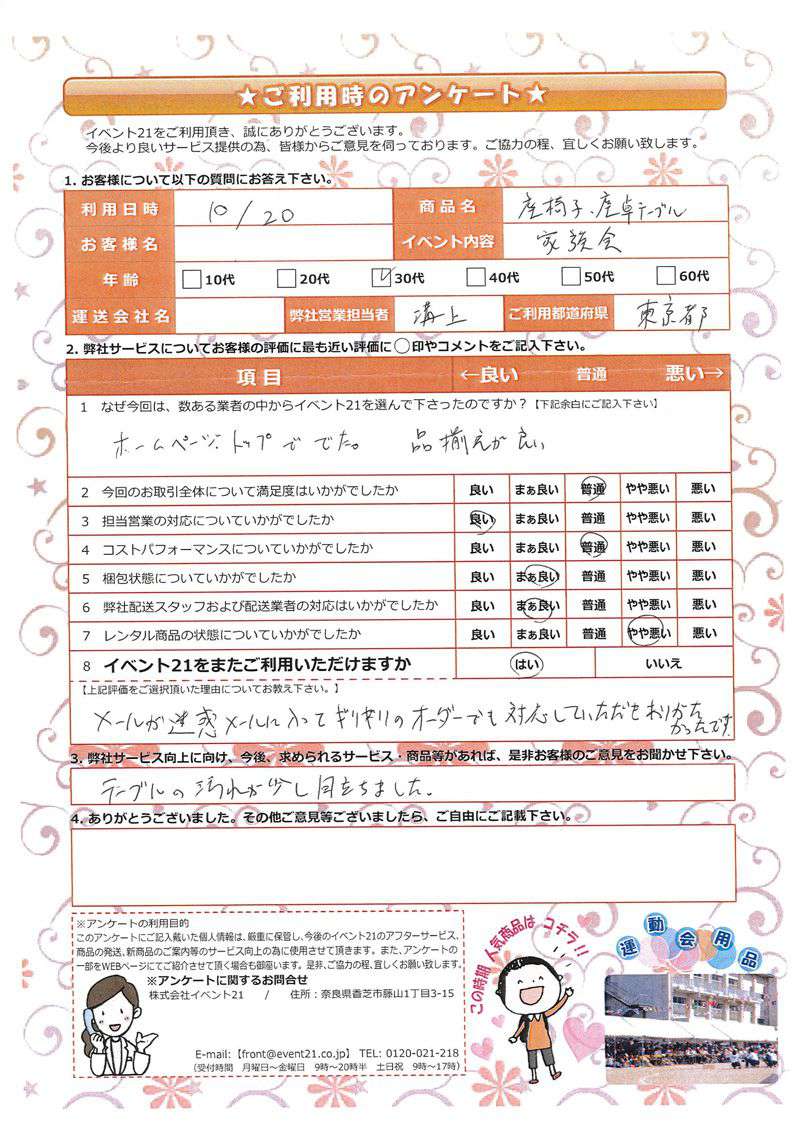 <株式会社イベント21> 本社:奈良県香芝市藤山1-3-15 配送センター:奈良県葛城市竹内811 TEL / 0745-77-6882 FAX / 0745-77-6981 front@event21.co.jp