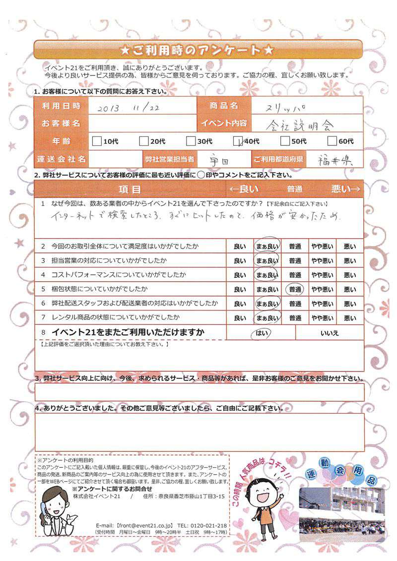2013年11月にご利用いただいた40代、福井県のお客様より。