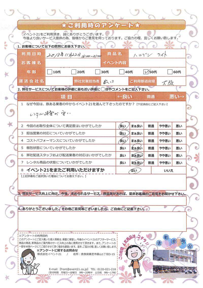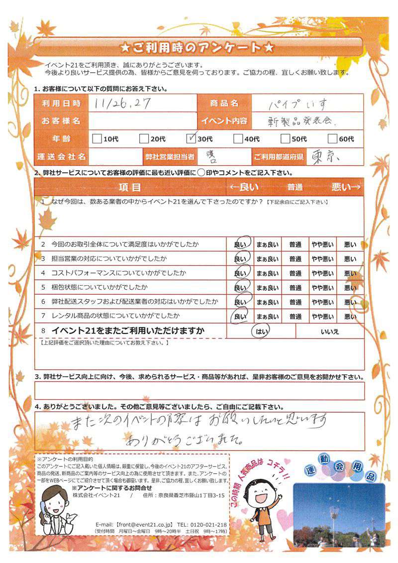 この度は当社をご利用いただき誠にありがとう御座います。 台風が近づきはらはらする部分も有りましたが、イベントが無事成功されたとお伺いしほっとしております。 また何かご入用の際はお気軽に御連絡下さい