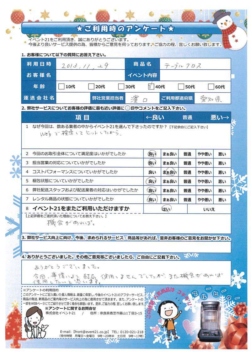 2013年12月にご利用いただいた40代、愛知県のお客様より。