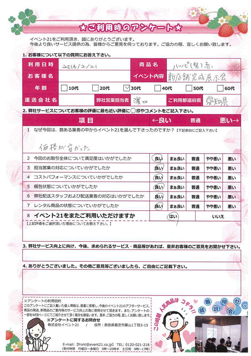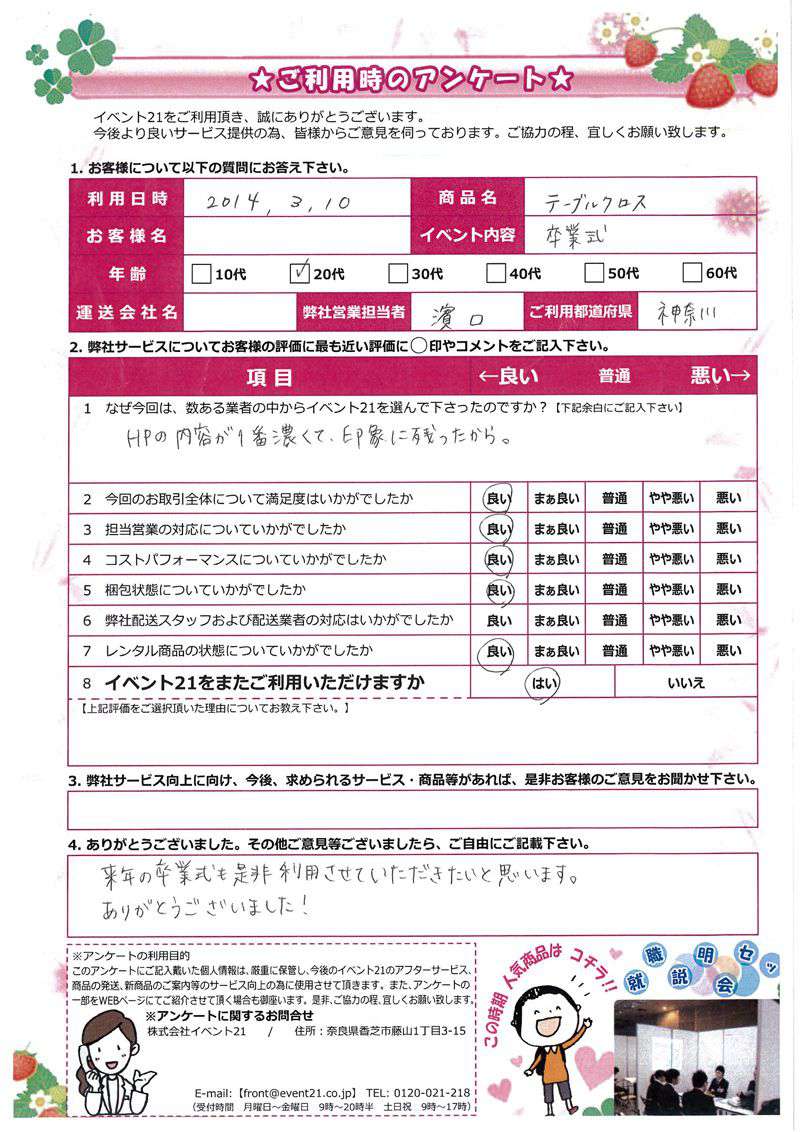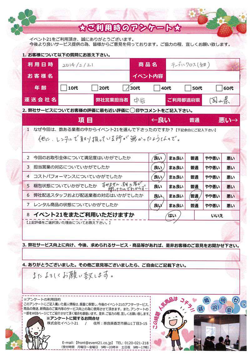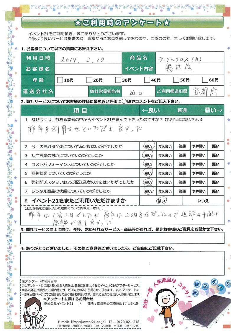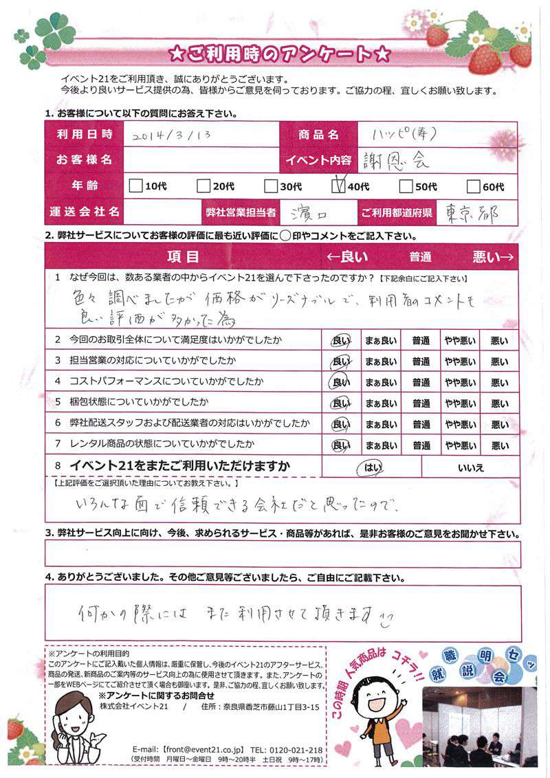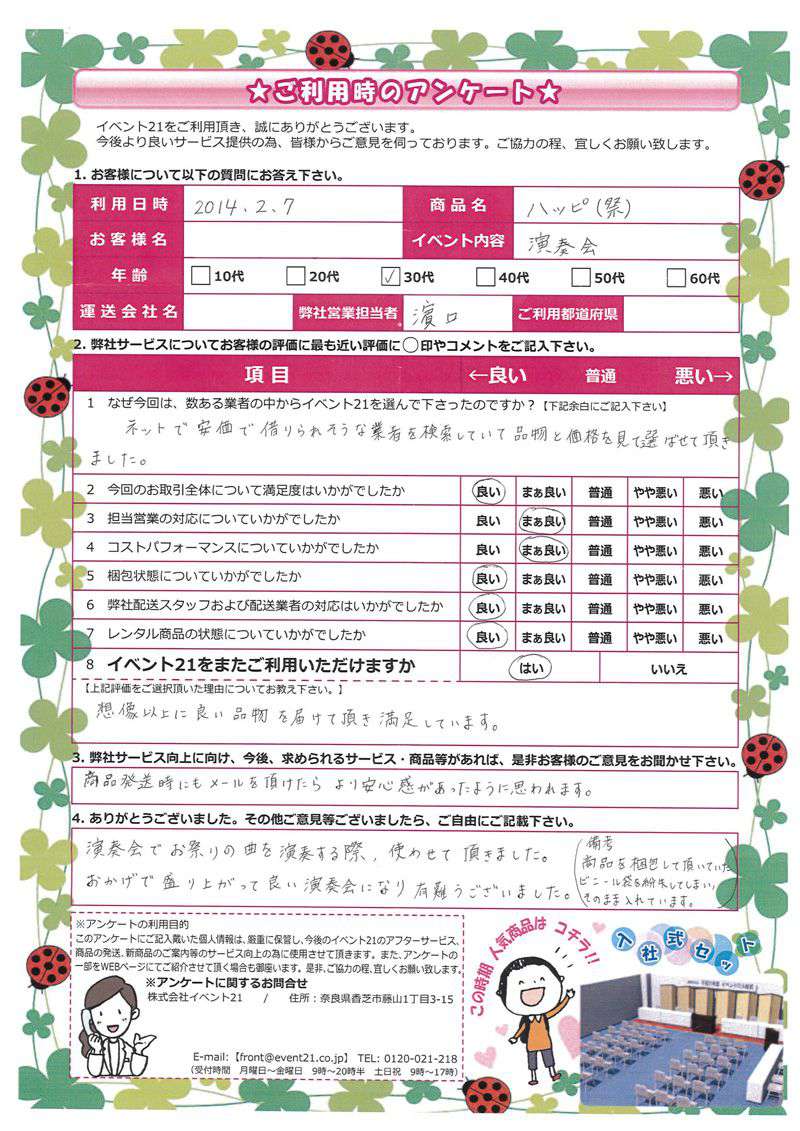 この度は弊社をご利用いただき誠にありがとうございます。 お客様のイベントが大成功するよう精一杯努力しますのでまたなにかありましたらよろしくお願い致します。