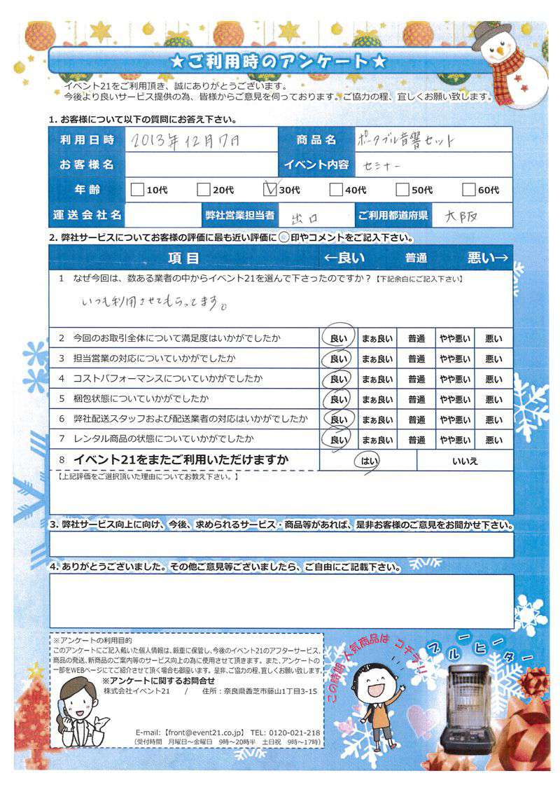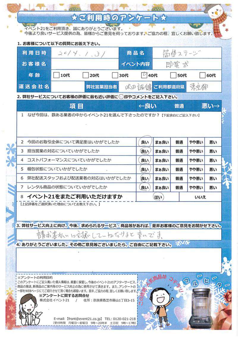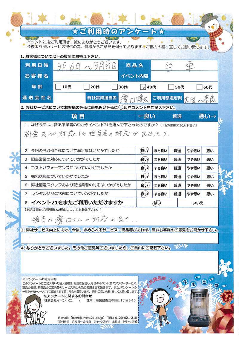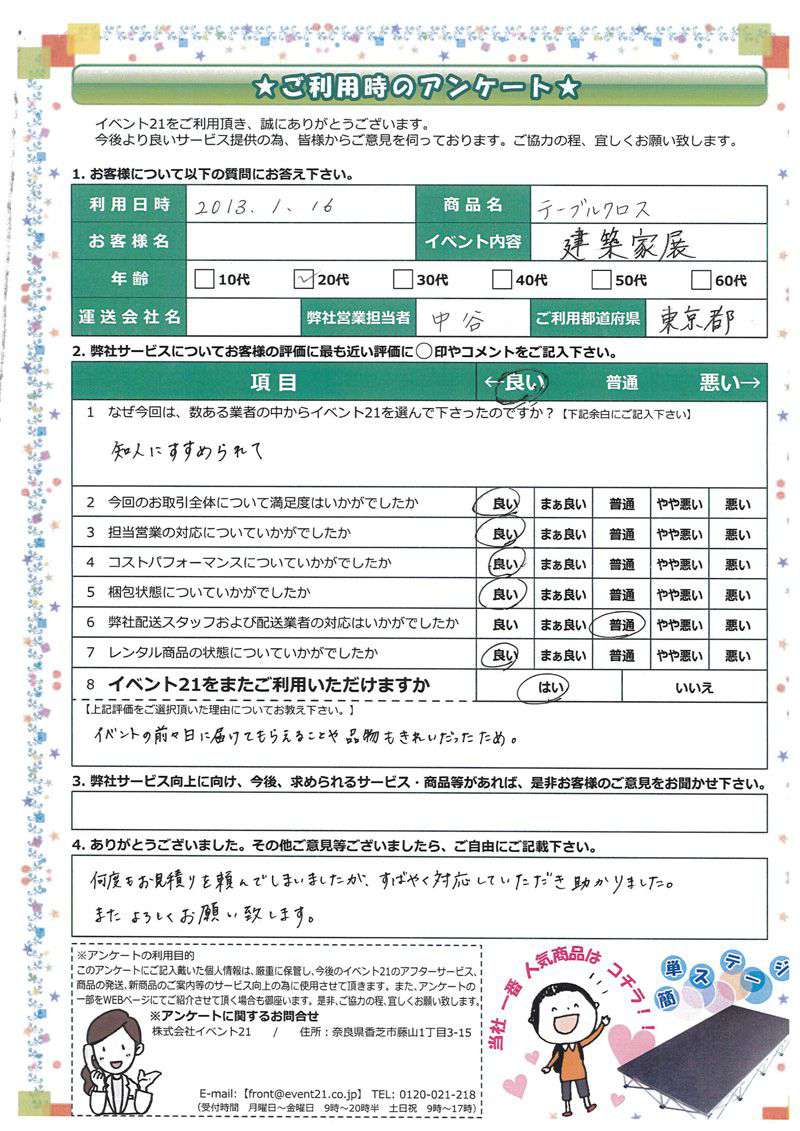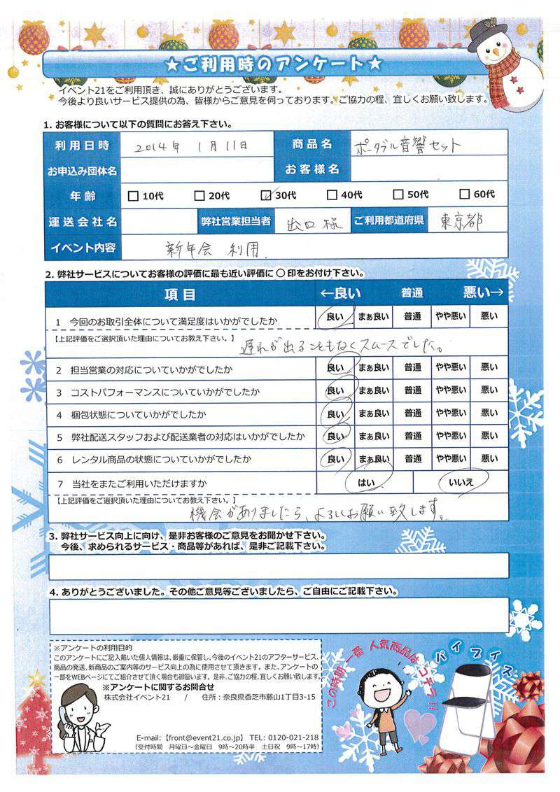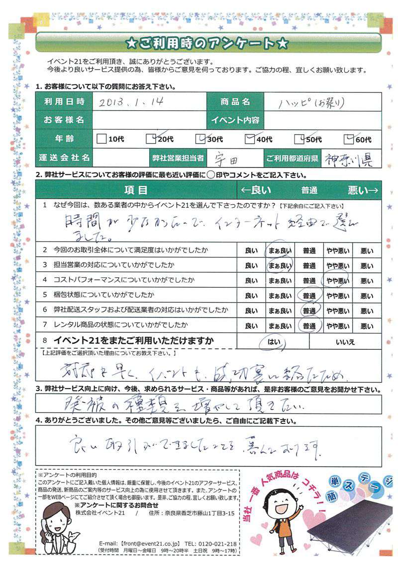 この度は弊社をご利用いただき誠にありがとうございます。 お客様のイベントが大成功するよう精一杯努力しますのでまたなにかありましたらよろしくお願い致します。